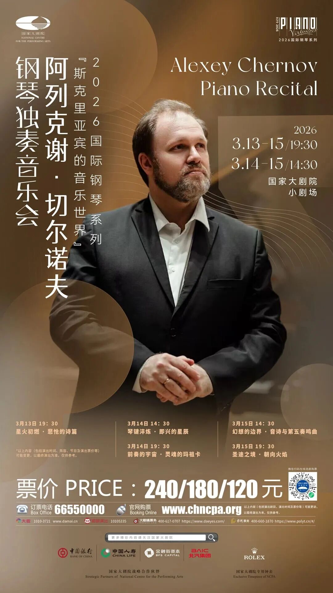 3月13-15日,阿列克谢·切尔诺夫将登上国家大剧院的舞台,为乐迷带来“斯克里亚宾的音乐世界”。届时,包括斯克里亚宾的前奏曲、即兴曲、奏鸣曲、小品、舞曲等多种体裁在内的作品都将一一呈现,让我们一起期待!