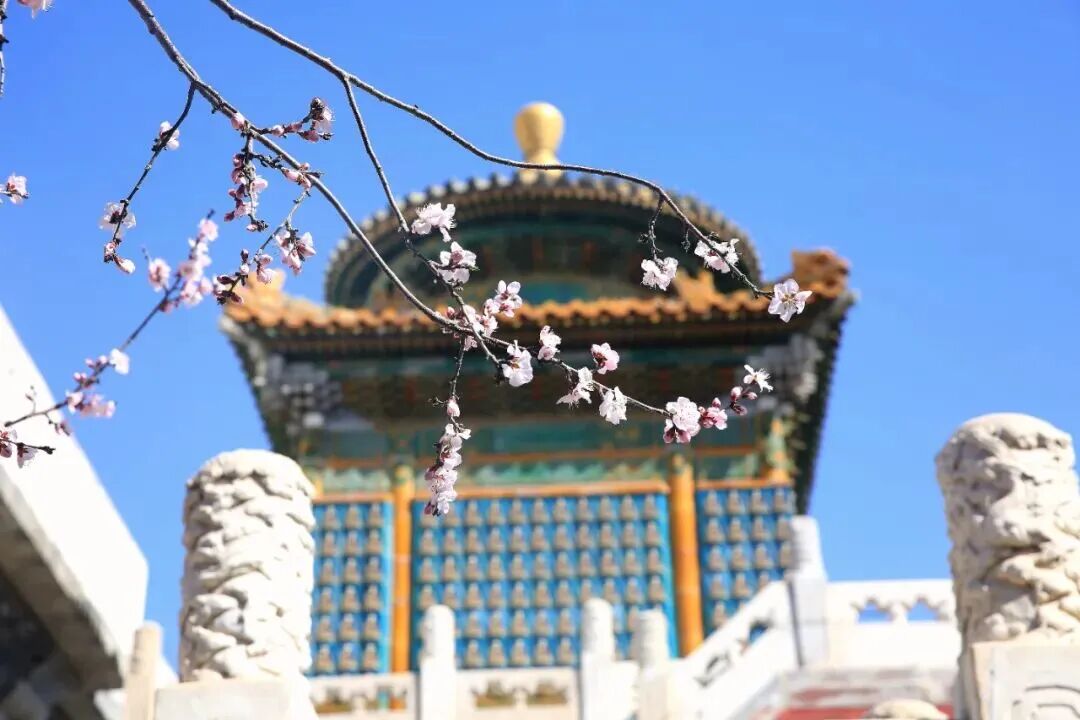 皇家御园,朱红色的宫墙、金黄色的屋顶脊兽与粉白娇嫩的桃花交相辉映,非常出片。