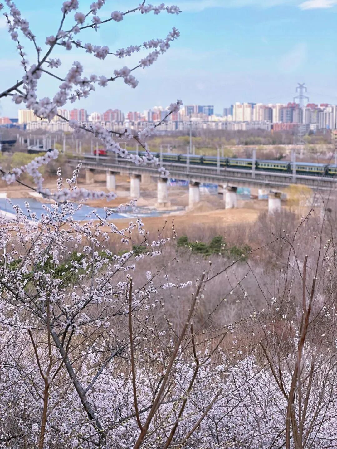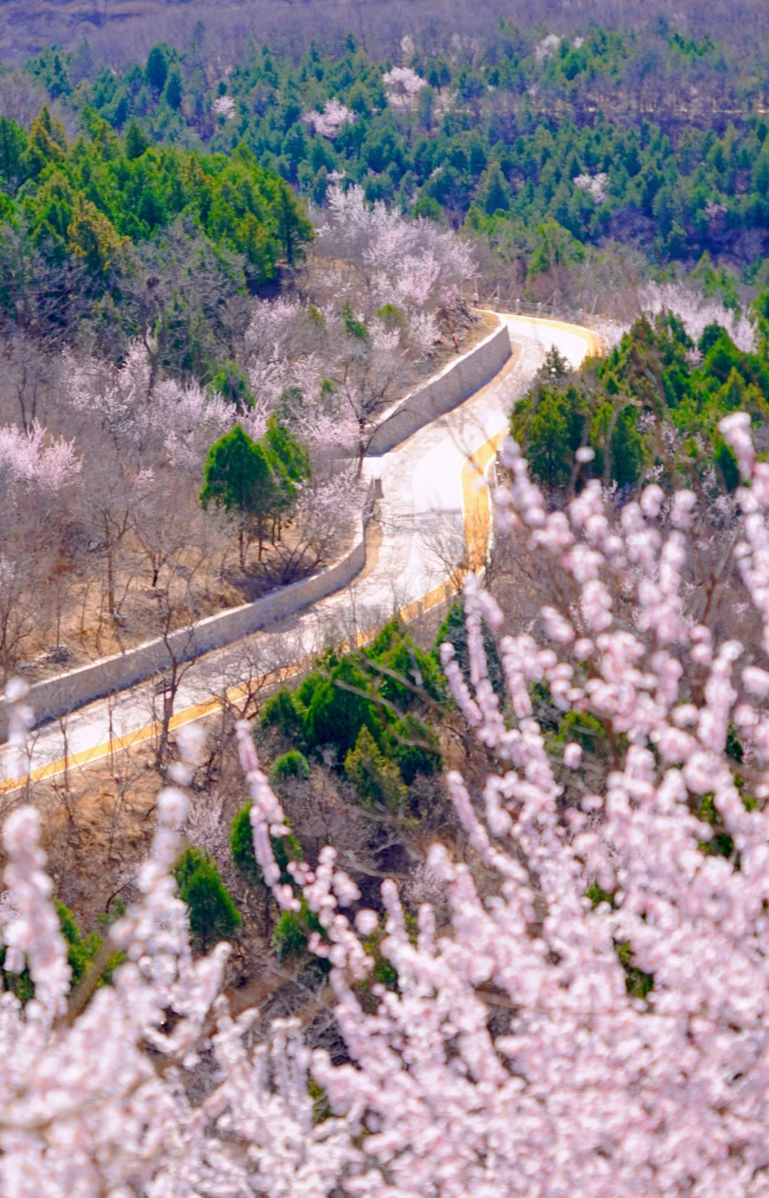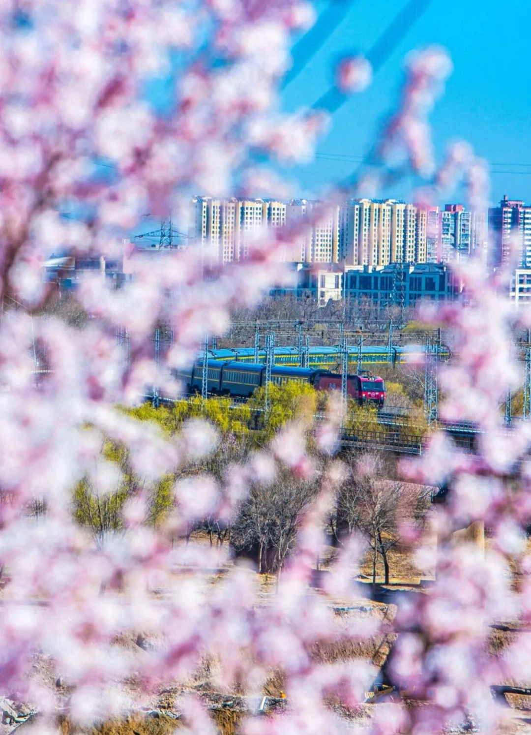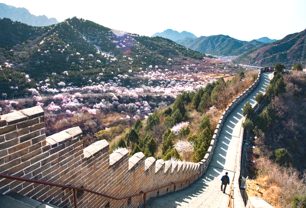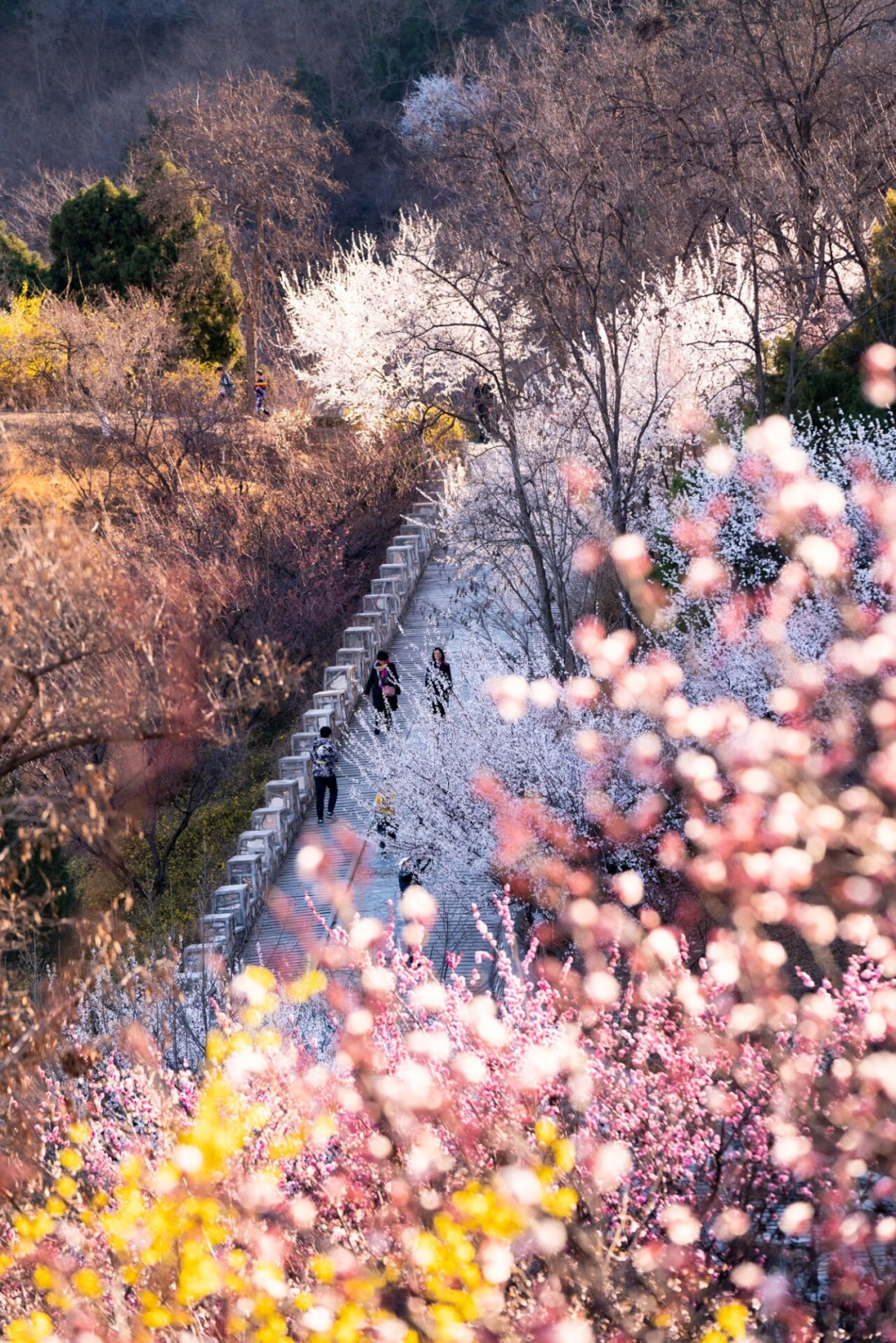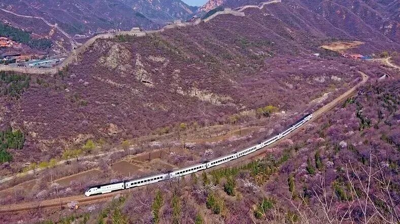 居庸关花海以杏花、山桃花为主,S2线是国内第一列“开往春天的列车”,行走在“百年京张”的铁路上,看长城蜿蜒,春花遍野。