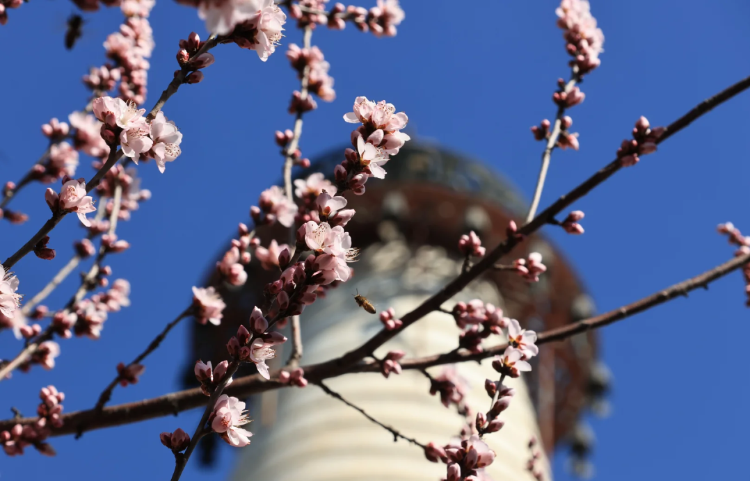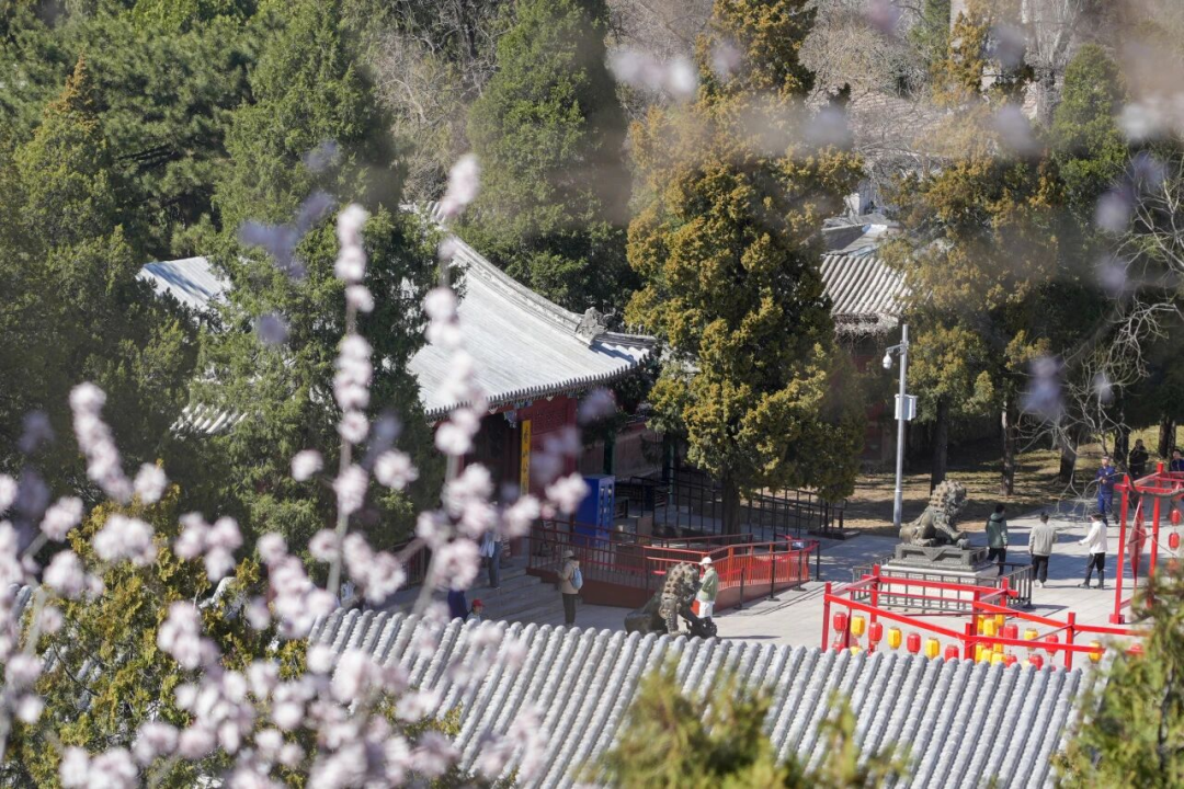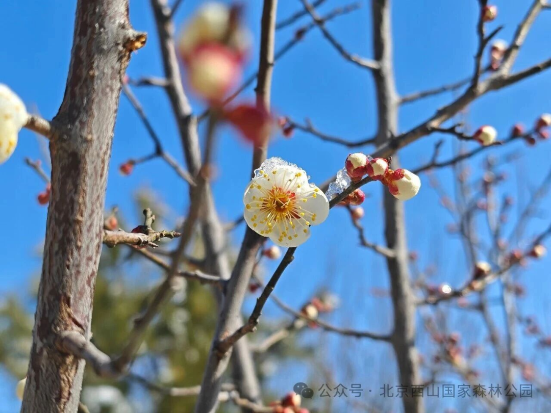春日香山,百花将绽。目前,园内蜡梅已进入花的末期,迎春陆续开放,山桃花、梅花含苞待放,粉白的花蕾缀满枝头,在苍翠山林间星星点点。