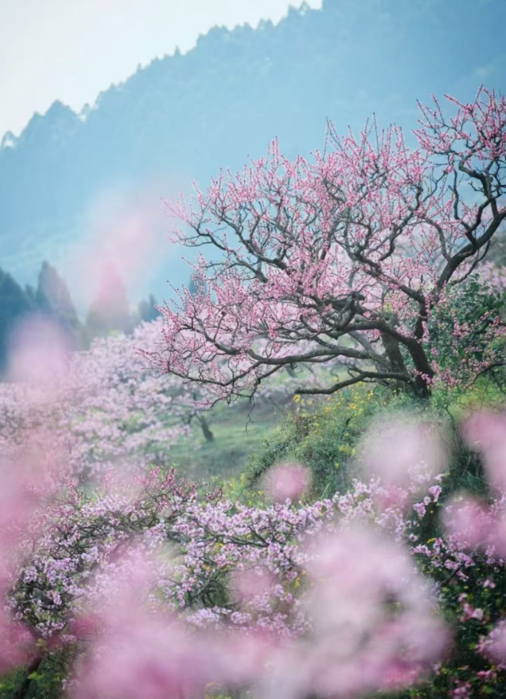 远远望去,一片片桃林宛如粉色的云霞,轻柔地笼罩着大地。
