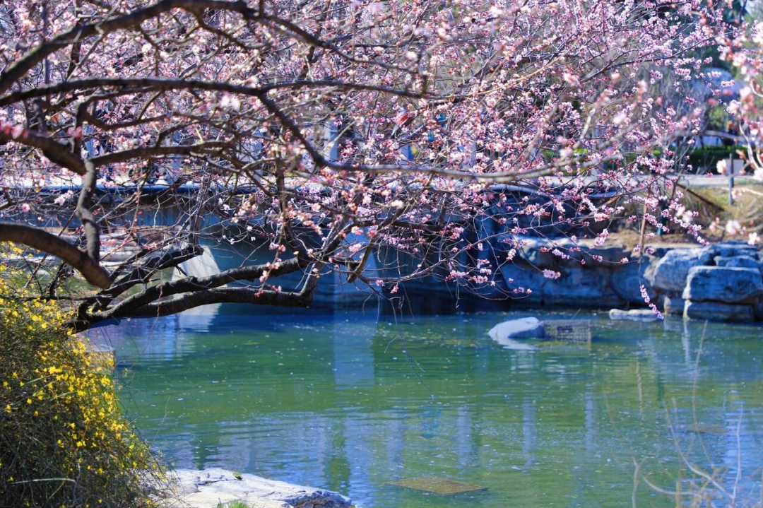 园内报春亭景区栽植了大量的山桃、迎春等花卉,此时一齐绽放,在松柏等常绿树的映衬下,如云似霞,金黄点点,春意盎然。