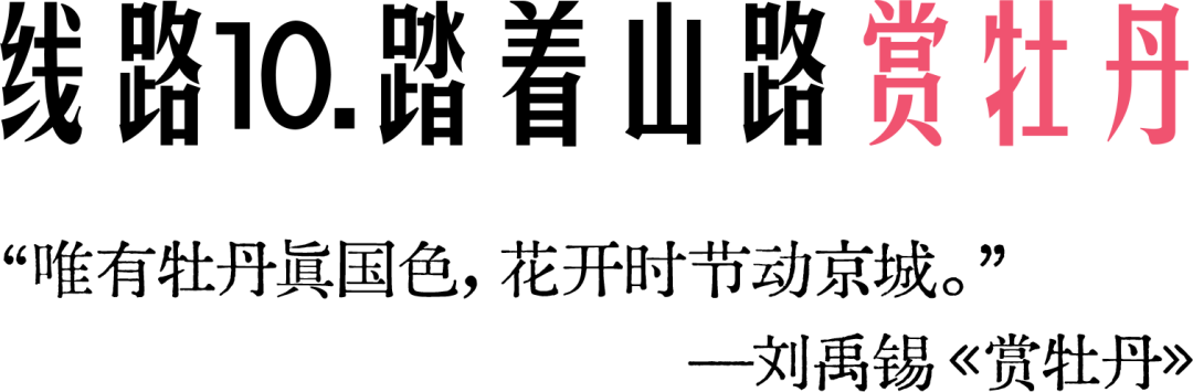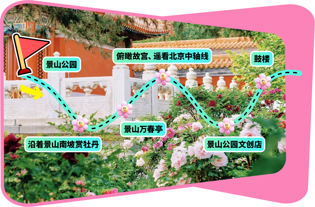 景山公园→沿着景山南坡赏牡丹→景山万春亭→俯瞰故宫、遥看北京中轴线→景山公园文创店→鼓楼