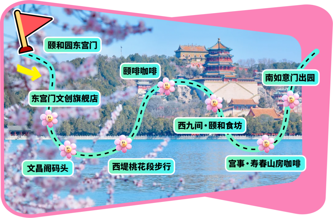 颐和园东宫门→东宫门文创旗舰店(买文创/盖章)→文昌阁码头(乘船,或者租电动船看西堤桃花)→西堤桃花段步行(临水拍花)→颐啡咖啡(湖景歇脚)→西九间·颐和食坊(圆梦烧饼/文创)→宫事·寿春山房咖啡(谐趣园庭院)→南如意门出园