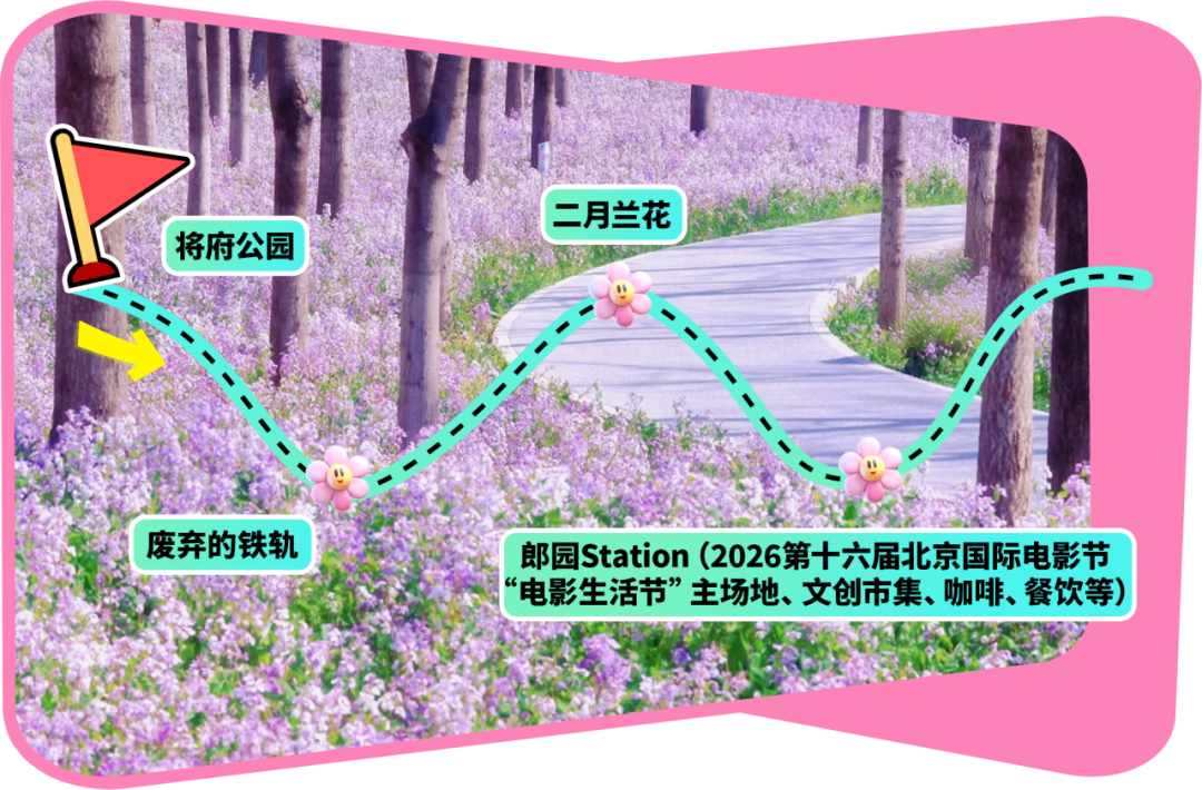 将府公园→废弃的铁轨→二月兰花→郎园Station(2026第十六届北京国际电影节“电影生活节”主场地、文创市集、咖啡、餐饮等)