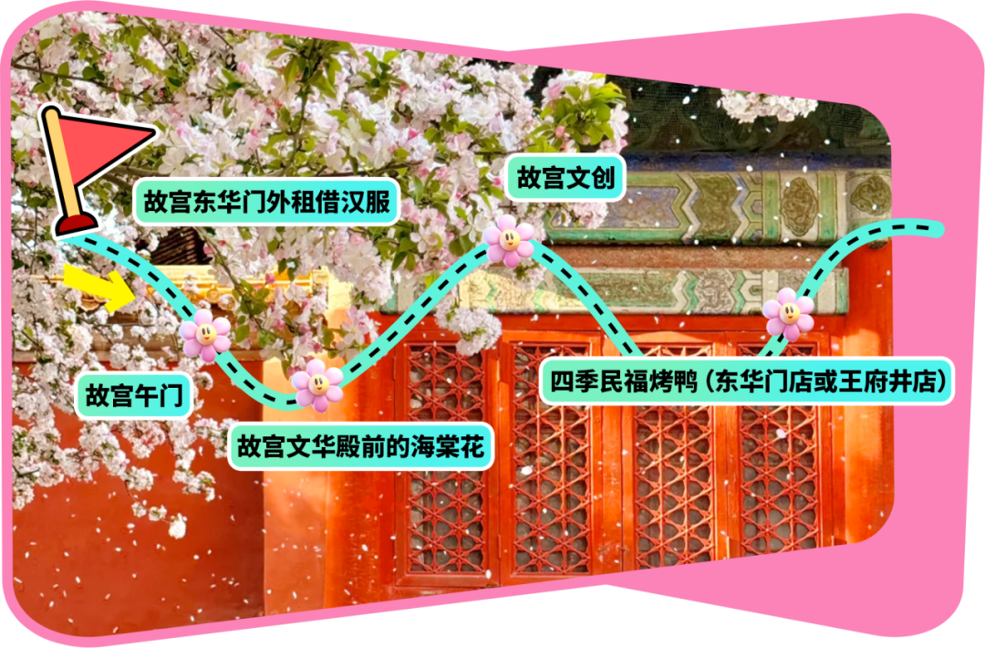东华门外租借汉服→故宫午门→故宫文华殿前的海棠花→故宫文创→四季民福烤鸭(东华门店或王府井店)