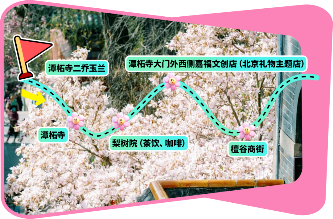 潭柘寺二乔玉兰→潭柘寺→梨树院(茶饮、咖啡)→潭柘寺大门外西侧嘉福文创店(北京礼物主题店)→檀谷商街
