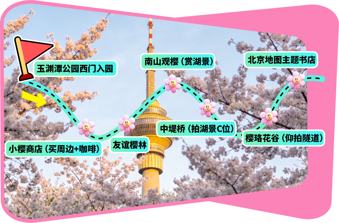 玉渊潭公园西门入园→小樱商店(买周边+咖啡)→友谊樱林→南山观樱(赏湖景)→中堤桥(拍湖景C位)→樱珞花谷(仰拍隧道)→北京地图主题书店