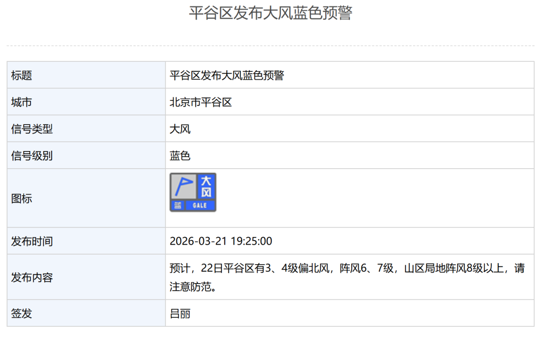 平谷区发布大风蓝色预警:预计,22日平谷区有3、4级偏北风,阵风6、7级,山区局地阵风8级以上,请注意防范。