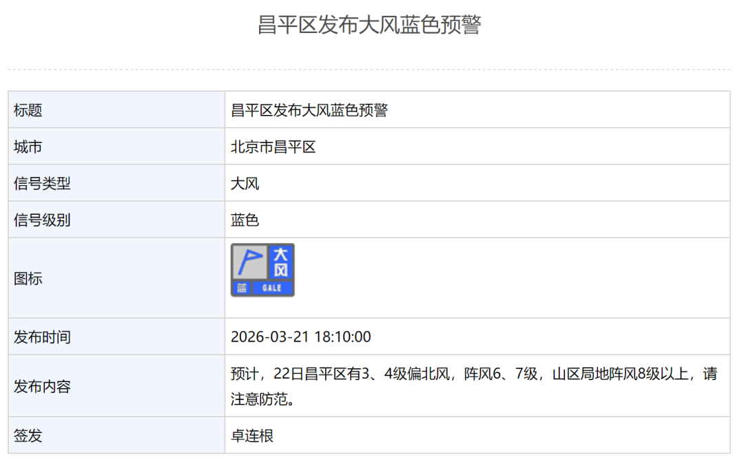 昌平区发布大风蓝色预警:预计,22日昌平区有3、4级偏北风,阵风6、7级,山区局地阵风8级以上,请注意防范。