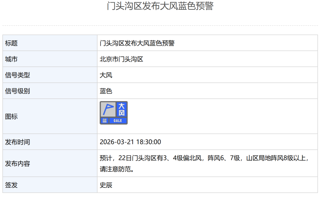 门头沟区发布大风蓝色预警:预计,22日门头沟区有3、4级偏北风,阵风6、7级,山区局地阵风8级以上,请注意防范。