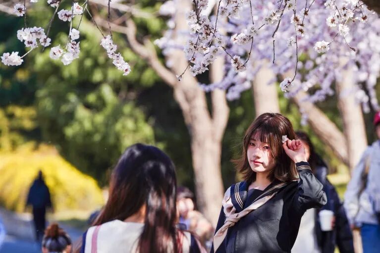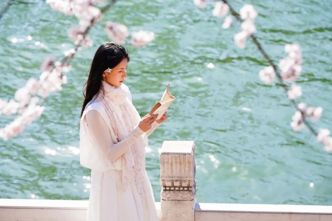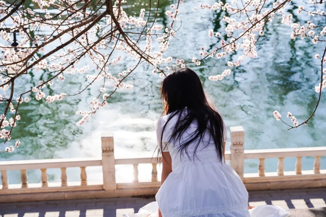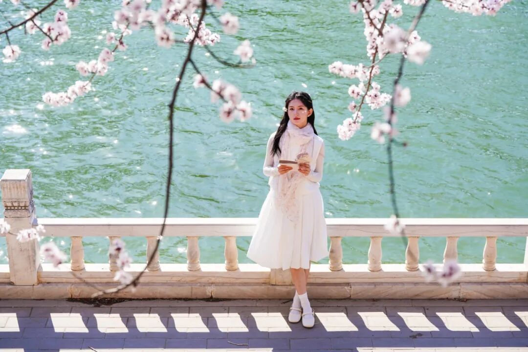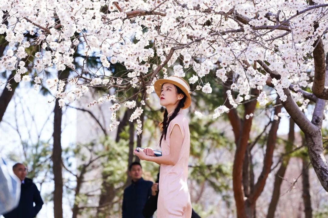 ▪️穿浅色系衣服(米白、浅蓝、浅粉),与粉白桃花、翠绿草坪适配度满分,清新又温柔;