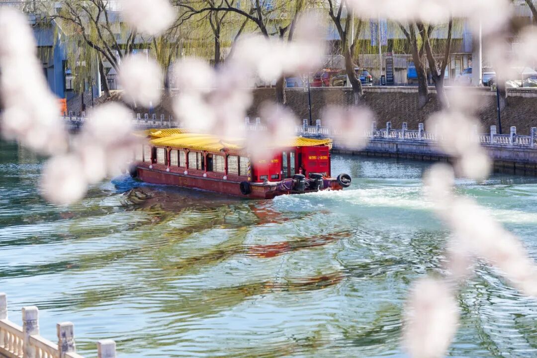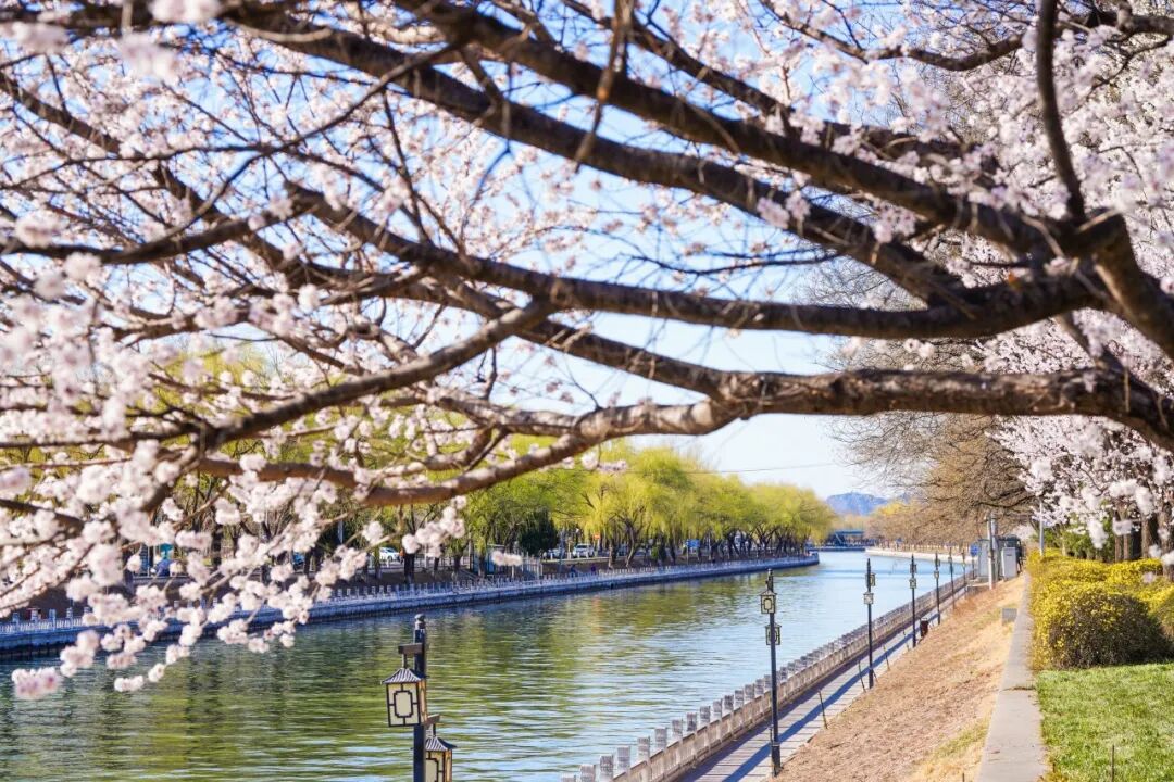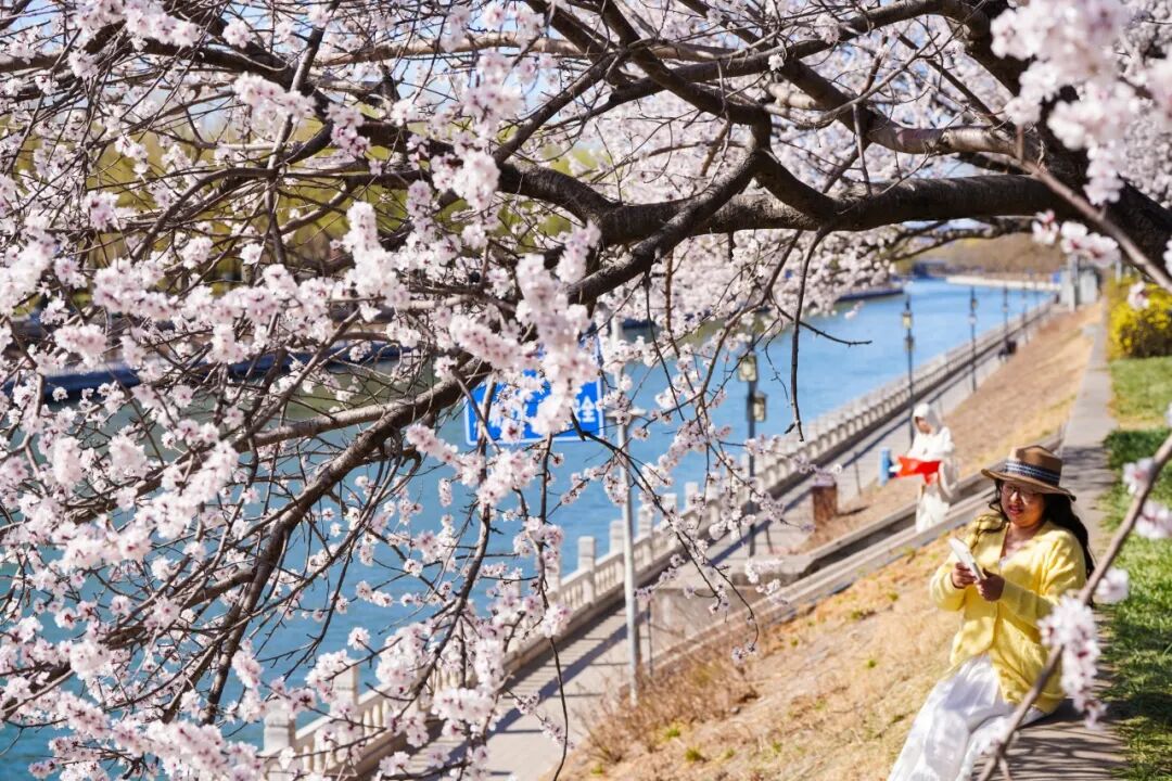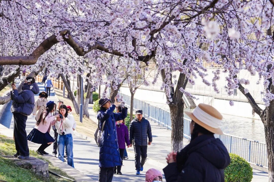 沿着昆玉河岸堤,成排的桃树舒展枝条,粉白的花瓣倒映在粼粼水波中,“春水初生,春林初盛”的诗意感直接拉满。