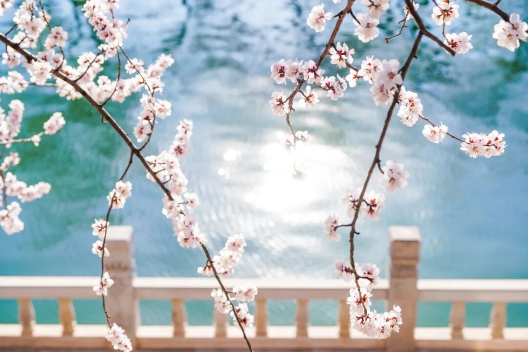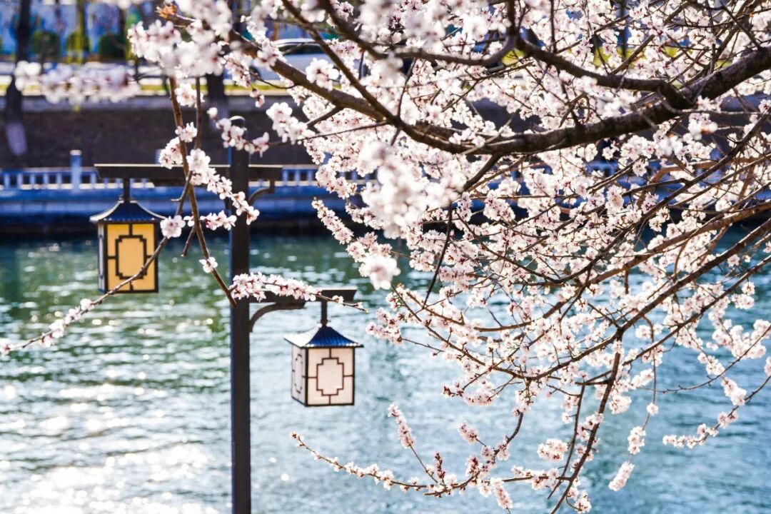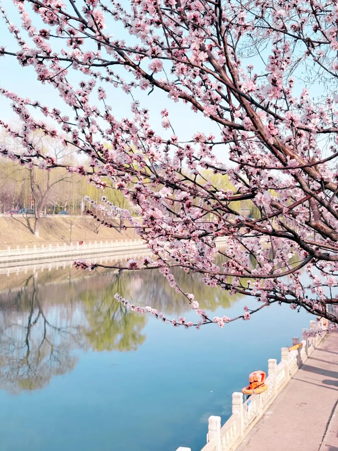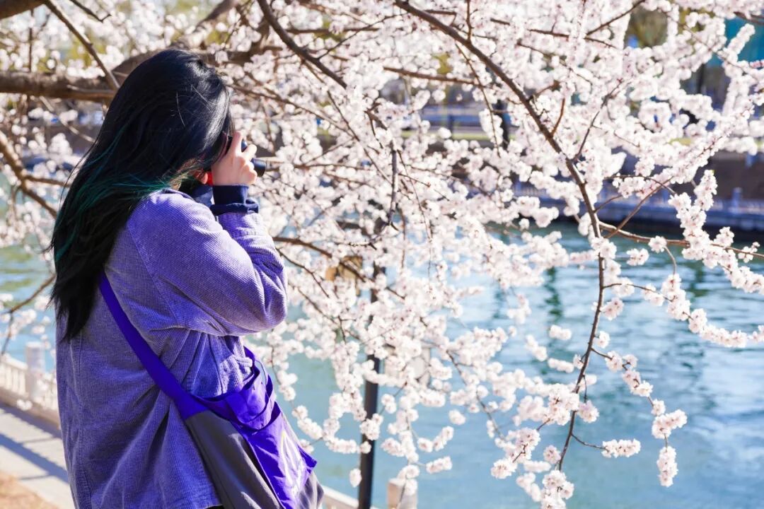 沿着昆玉河岸堤,成排的桃树舒展枝条,粉白的花瓣倒映在粼粼水波中,“春水初生,春林初盛”的诗意感直接拉满。