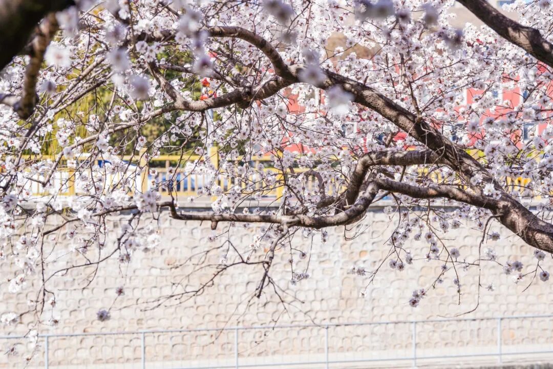 这里的桃花自带“日系滤镜”,枝条低垂,找好角度可以有贴近水面。风过时,花影随波动,走在沿河步道上仿佛闯入了动漫里的春日场景,温柔又治愈。
