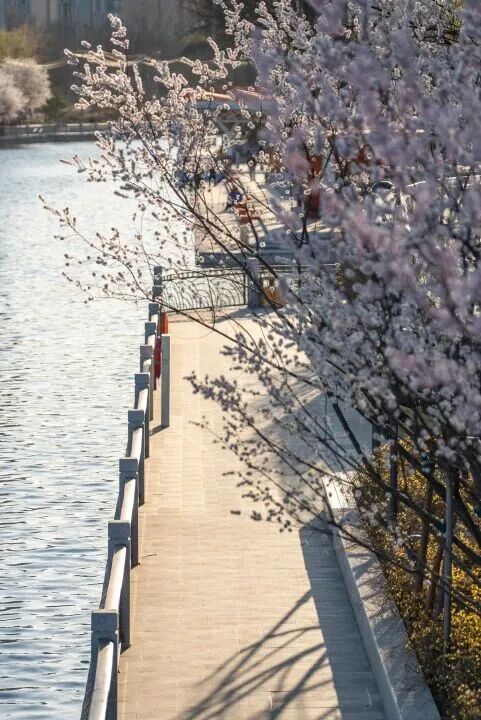 春风绕过街巷送来暖意,也把坝河滨水绿道上的山桃唤醒了,不知何时,粉嫩的花苞已经齐齐绽放,开得温婉沉静,花朵挂满枝头,花瓣可爱娇羞,灵动可人,浅粉、淡粉、粉白、粉红层层浸染,像晕开的胭脂,像天边的云霞。