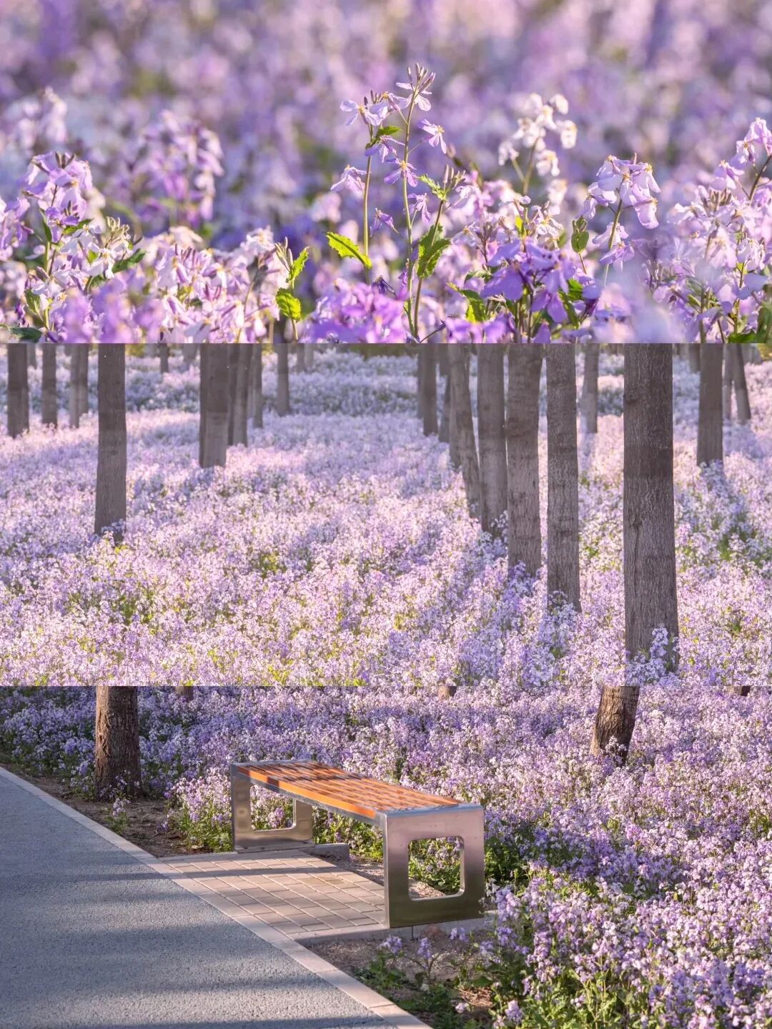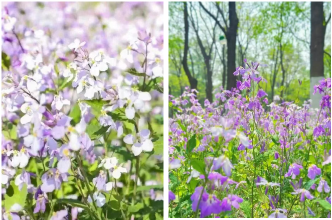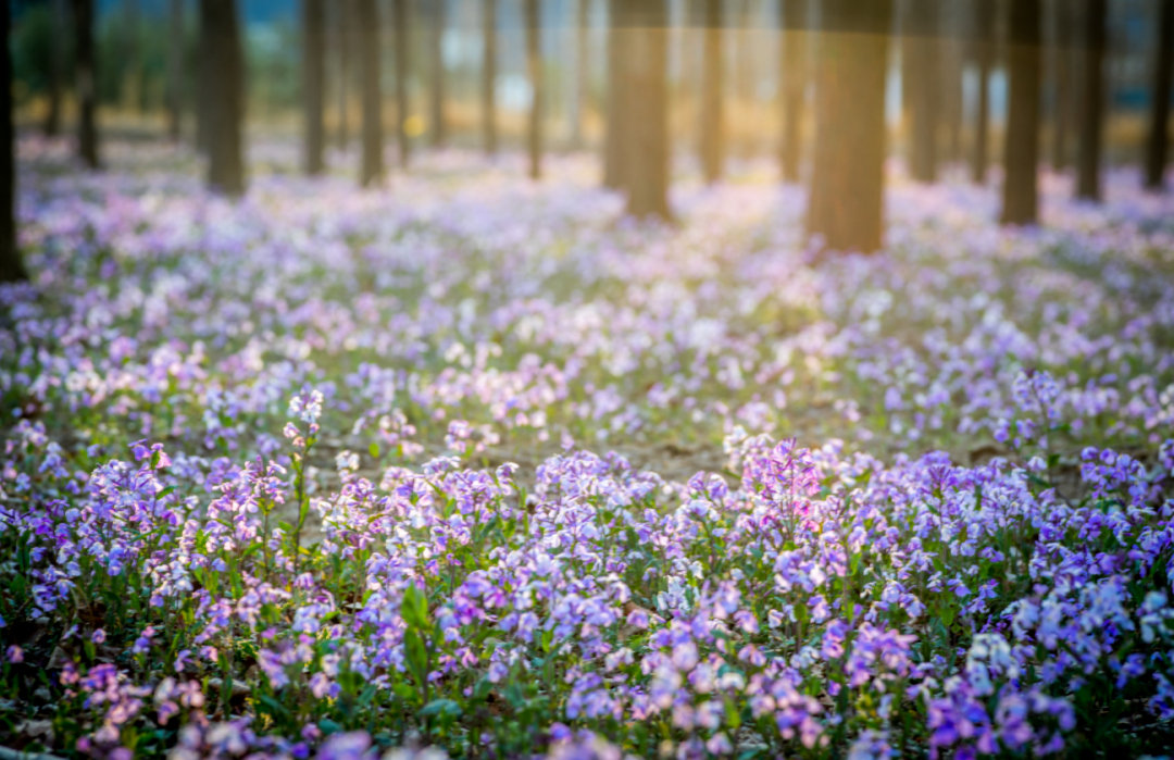 再步行10分钟到将府公园,春季二月兰成片绽放,紫色花海像闯进莫奈花园,蹲在花丛旁拍半身照,温柔又浪漫。