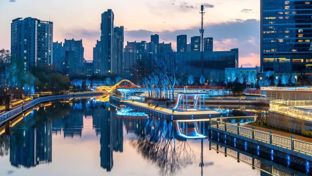 沿绿道向东走,橙色栏杆、露台桌椅超吸睛和河水的蓝、树叶的绿形成撞色,超合适拍“活力感”照片,重点打卡律动桥和悬日桥——傍晚5点左右,悬日桥会被夕阳染成粉色,桥体灯光渐变成琥珀蓝、荧光粉,倒影在水面上像碎星星,站在桥中间拍全景,氛围感直接拉满。