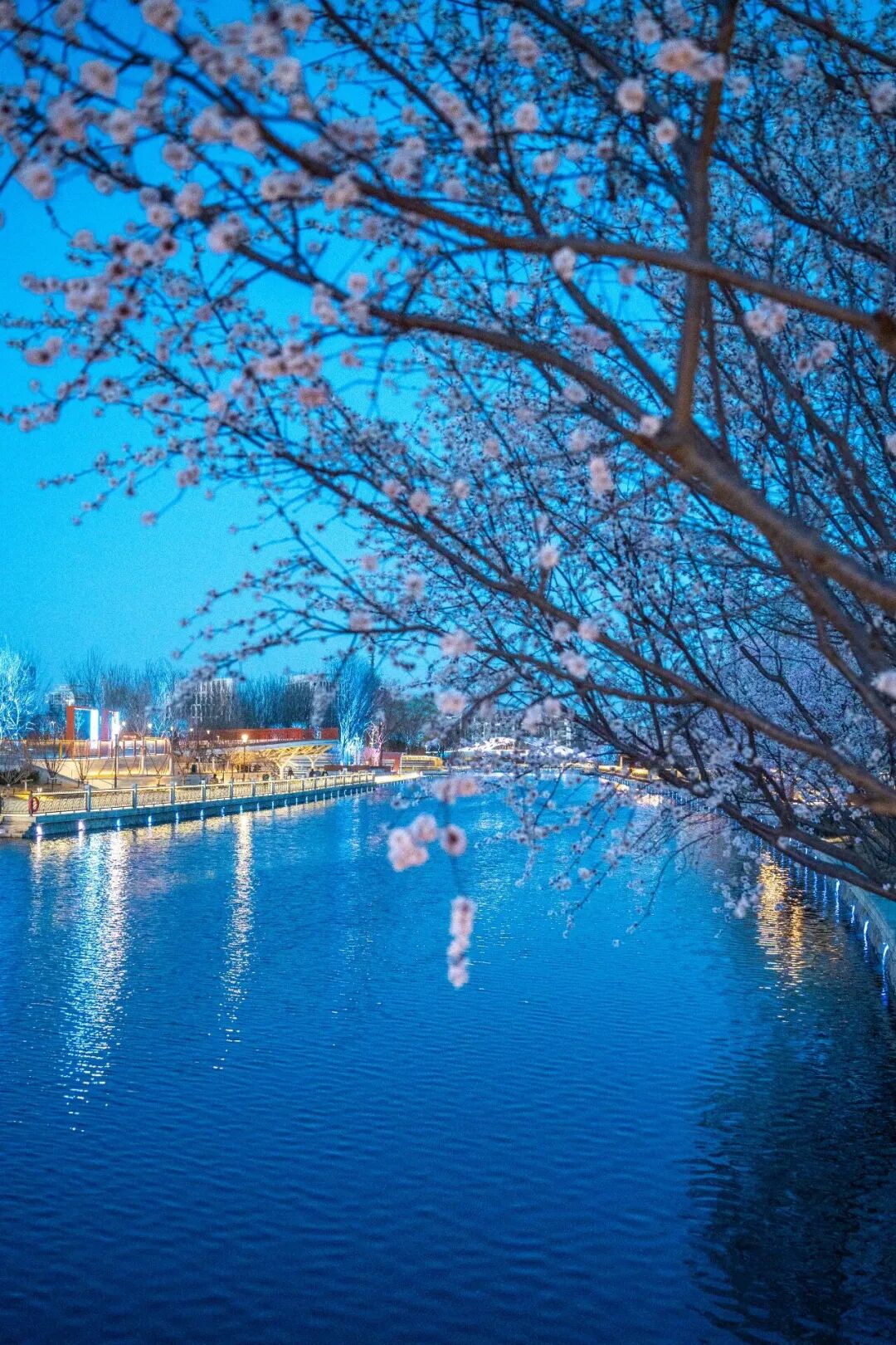 华灯初上,夜色未央,坝河沉浸在蓝色光晕里,两岸的花色也染上了光的绚烂,让浅浅的粉色叠加成渐变色,美轮美奂,醉人心扉。