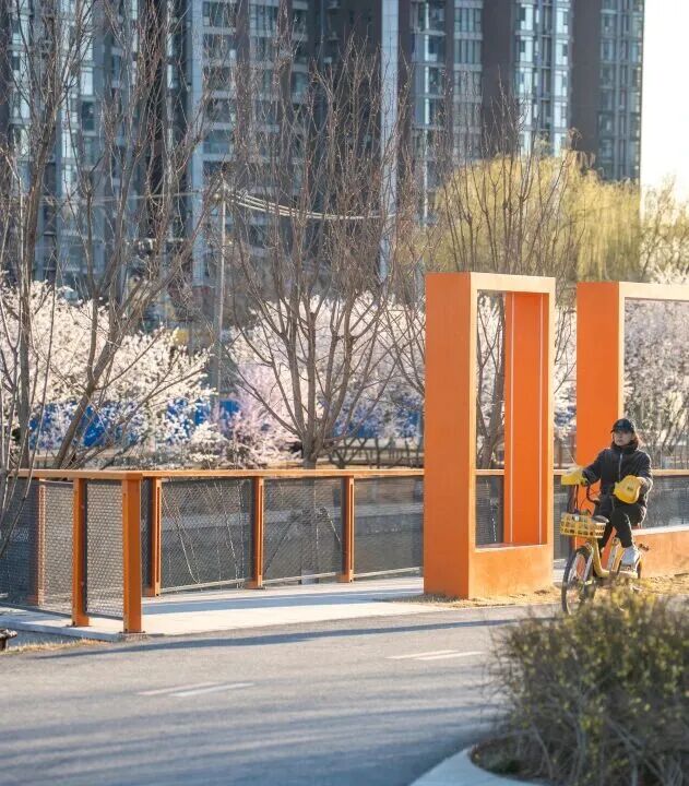 西起颐堤港沿坝河骑行道向东,全程无陡坡,路面平整,沿途能看河水、花海,风吹过超舒服,推荐“颐堤港→郎园Station”段(约2.3公里),春季山桃、海棠开在路边,骑行时像穿越花廊。