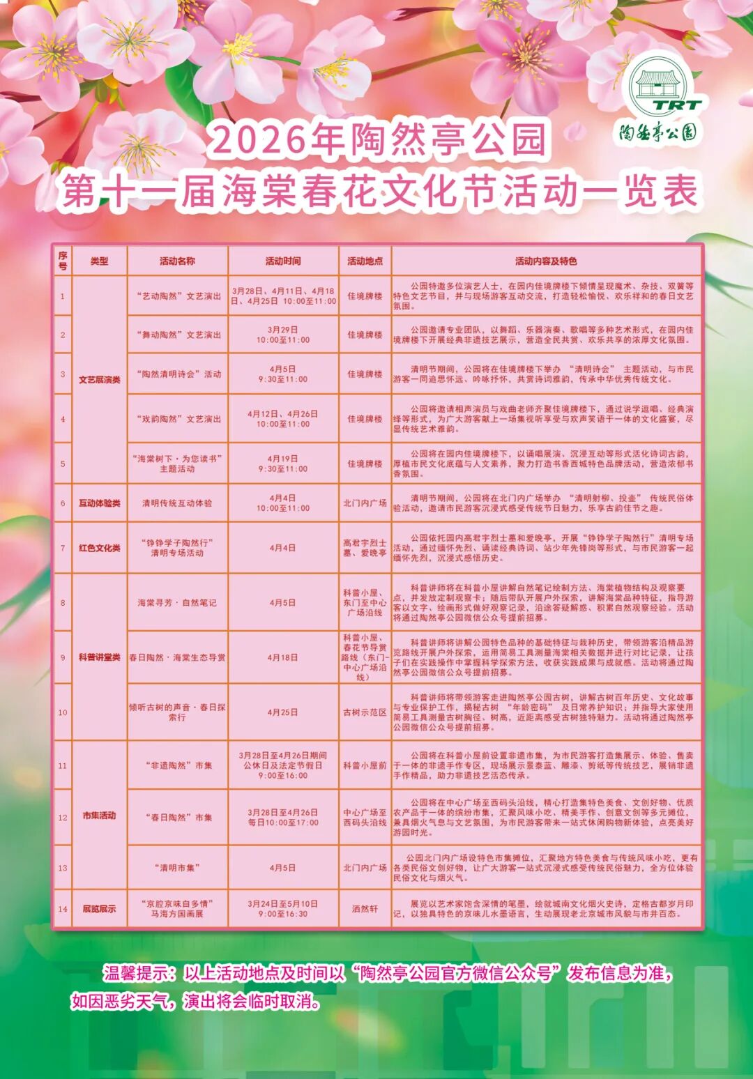 此外,清明诗会、世界读书日主题活动也将轮番上演,洒然轩内“京腔京味自多情——马海方国画展”同步开展,增添浓厚人文底蕴;游客市民可关注“北京市陶然亭公园”官方公众号,报名参与春日探索、海棠寻芳等科普活动(更多活动信息,详见文末活动一览表)。