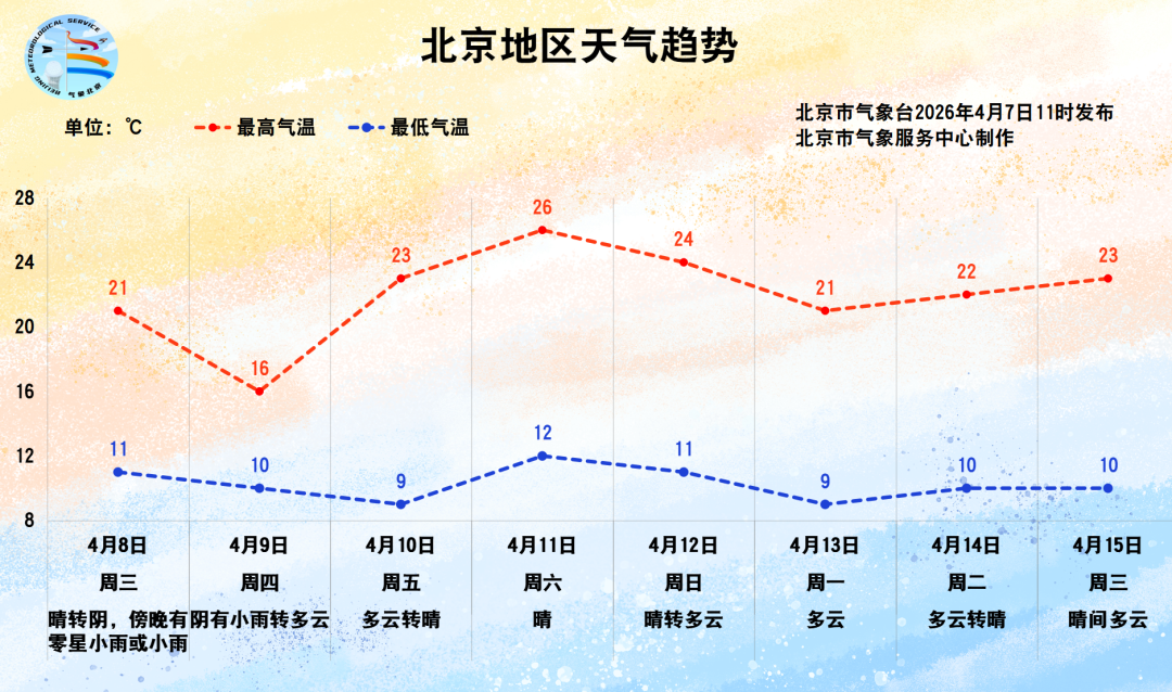 8 日(周三)白天:晴转阴,傍晚有零星小雨或小雨;北转南风 2~3 级; 平原地区最高气温 21℃,山区最高气温 19~22℃;最小相对湿度 30%。