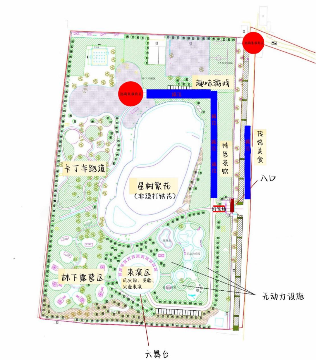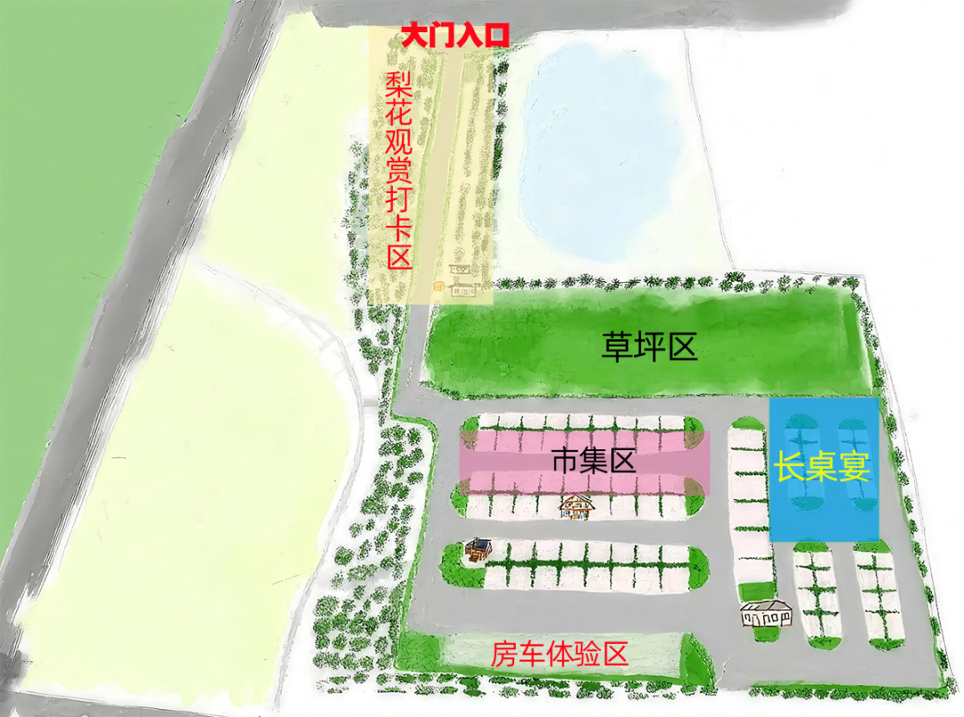 核心体验:园内配备碰碰车、卡丁车、充气城堡、彩虹滑道等亲子游乐设施,设置梨花露营区,布设50余家精品摊位,吃喝玩乐一应俱全。