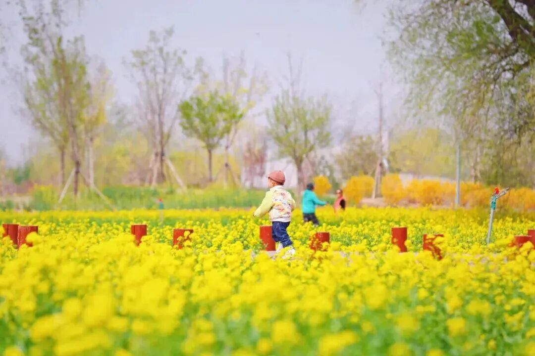 永定公园百亩油菜花海金黄翻涌,海棠、碧桃、紫荆、连翘粉红嫩黄缀满枝头,林下二月兰铺展成淡紫色花毯,各色繁花与垂柳新绿交织,倒映碧波之中呈现层次丰富的生态花海景观。