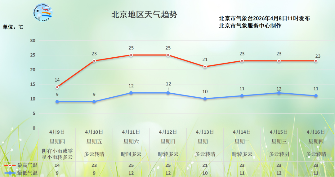 北京市气象台8日11时发布:今天下午晴转阴,傍晚西部北部有小阵雨,北风一级转南风三级,阵风五级左右,最高气温21℃;夜间阴有小到中雨,南转北风一二级,最低气温10℃。今天傍晚至明天夜间有降雨过程,出行请携带雨具并注意交通安全。
