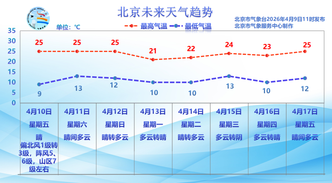 10 日夜间:晴;偏北风 2~3 级;平原地区最低气温 9℃,山区最低气温 5~7℃。