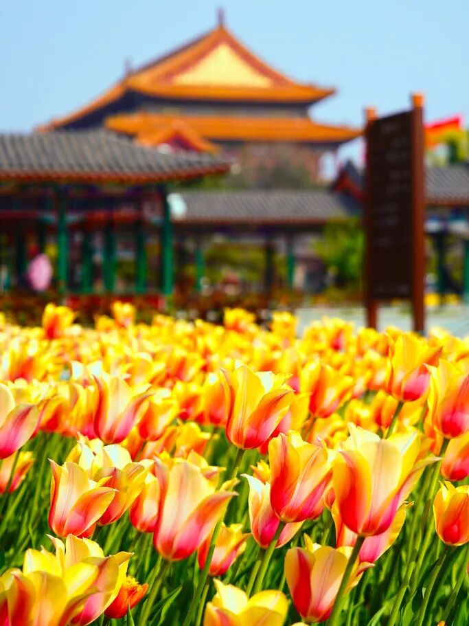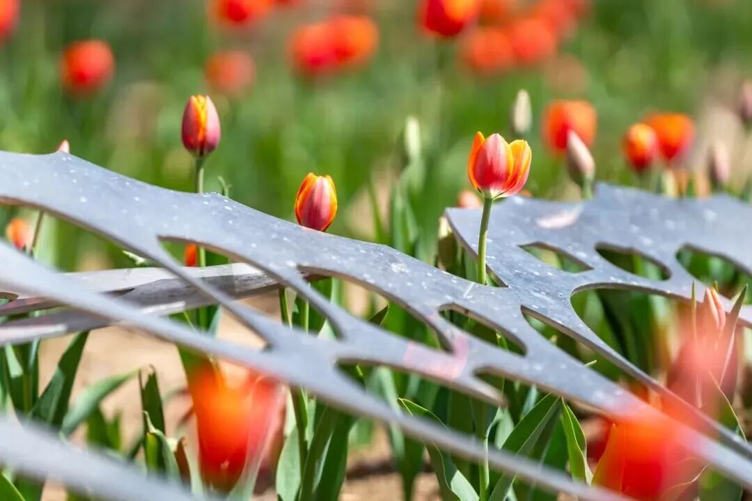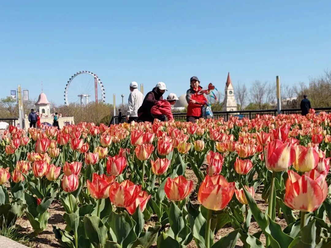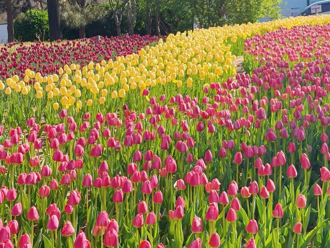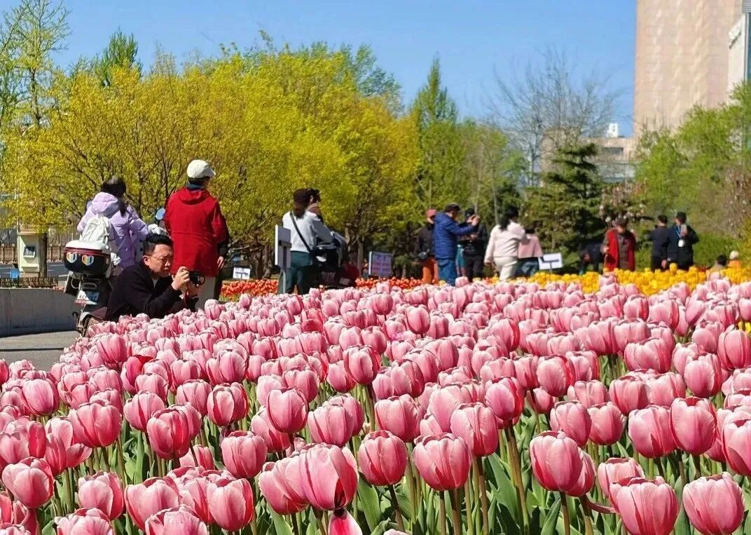 漫步园中,各色郁金香竞相绽放,与周边的城市肌理相映成趣,一边是繁华日常,一边是花海静谧。