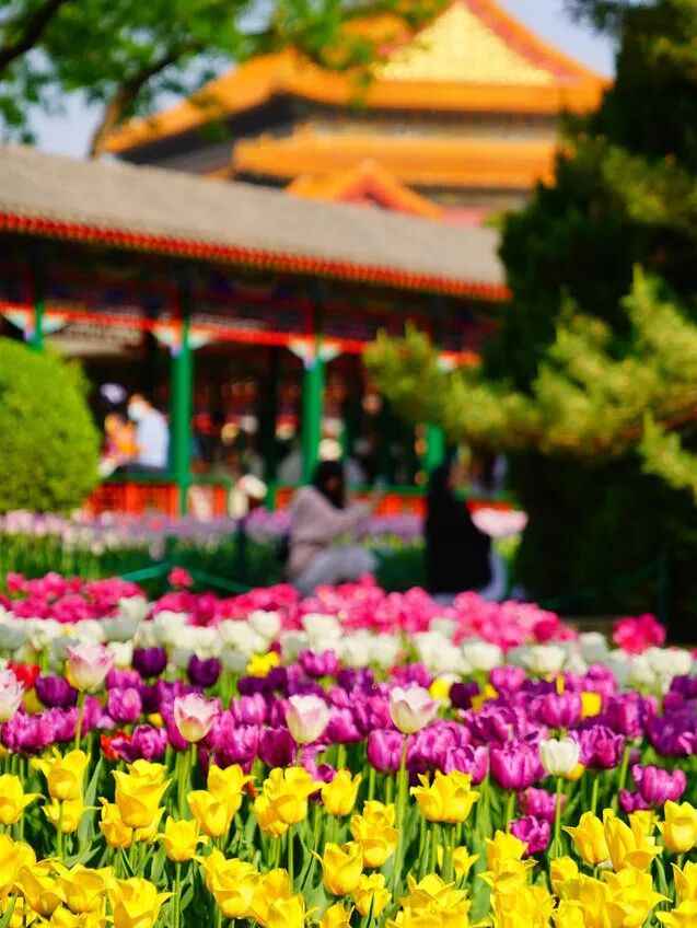 去中山公园赏郁金香是在北京“过春天”独有的仪式感。目前,中山公园内各色郁金香已进入盛花期,四月的阳光在花茎间流淌,郁金香如春日里最温柔的梦境,落落大方地舒展着花瓣,缤纷的色彩像是打翻的调色盘。