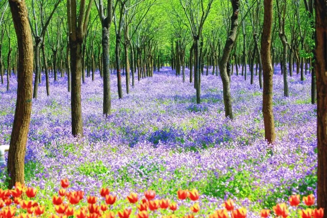 不远处,粉白相间的海棠花缀满枝头,林下500余亩的二月兰铺成淡紫色花毯,上中下构成梦幻空间,10公里骑行道贯穿其间,滨河生态与绚烂花海相融,呈现春日里浓烈梦幻的七彩画卷。