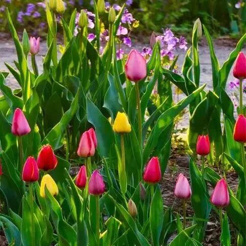 红色热烈奔放如火焰跳动,紫色神秘优雅似云霞揉碎,黄色明媚温暖像撒落星光,白色纯洁无瑕若仙境精灵,各色郁金香错落交织,深浅交错,冷暖相依,每一朵都在诉说着春天的美好故事。