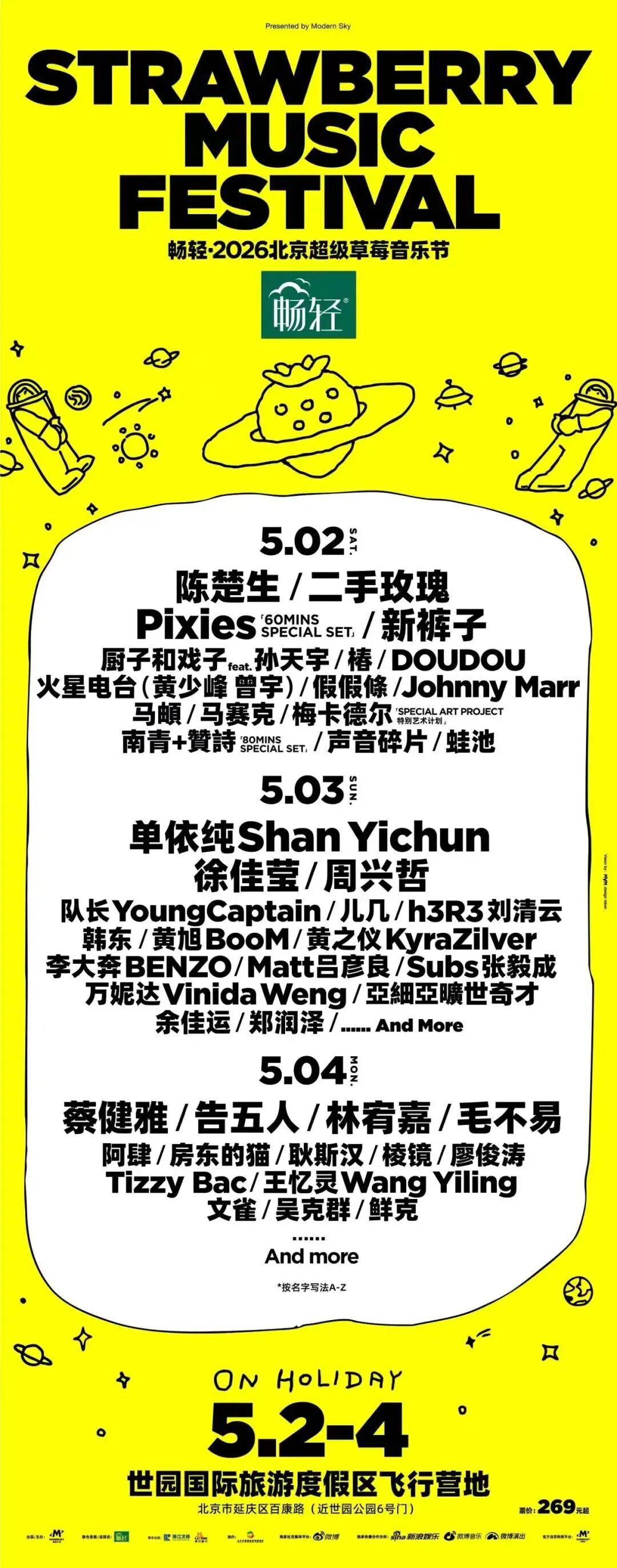 2026年5月2日-4日北京超级草莓音乐节,再度来到世园公园飞行营地,三天三大舞台49个演出时段将带来躁动的音浪、炙热的舞台和自由的灵魂,在「畅轻·草莓舞台」与「爱舞台」的声浪中,与万千乐迷一起。