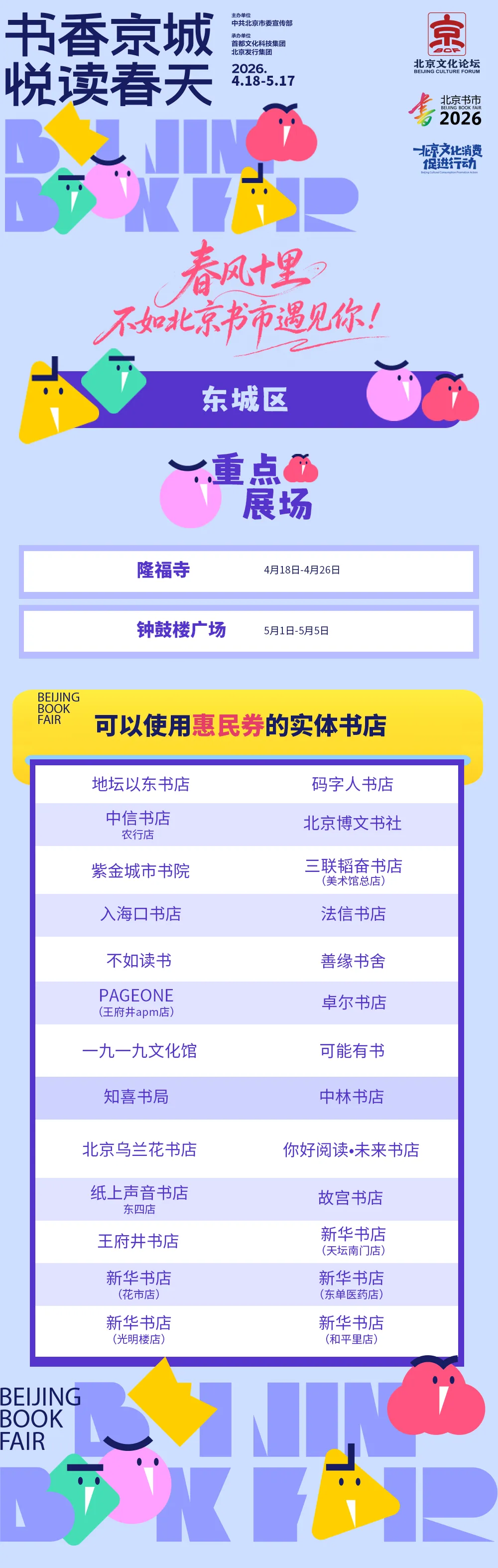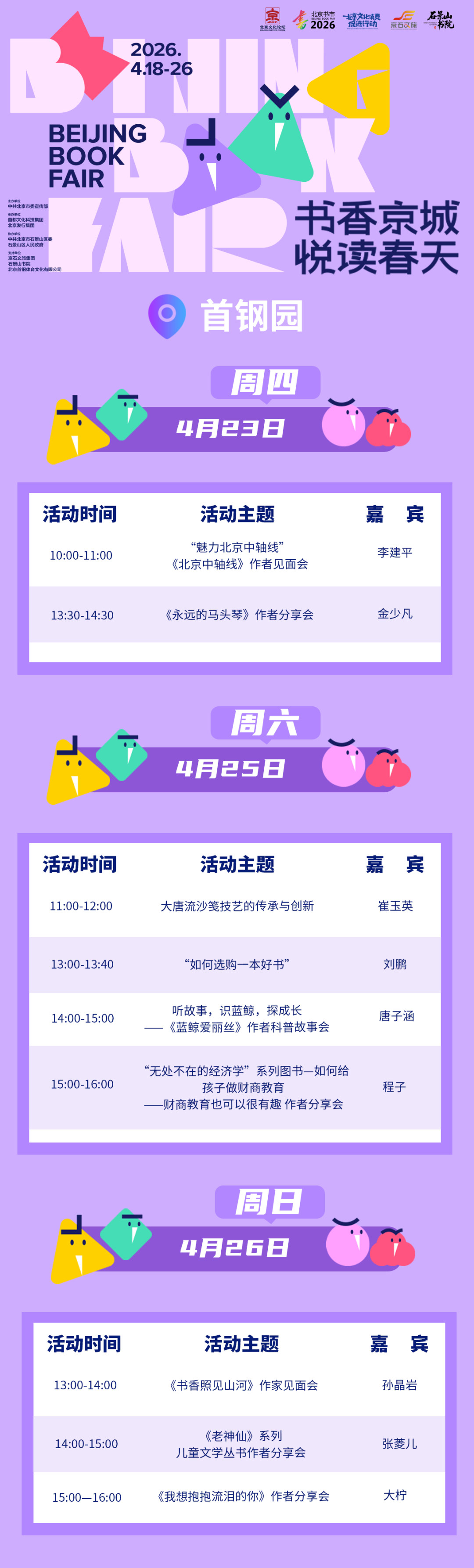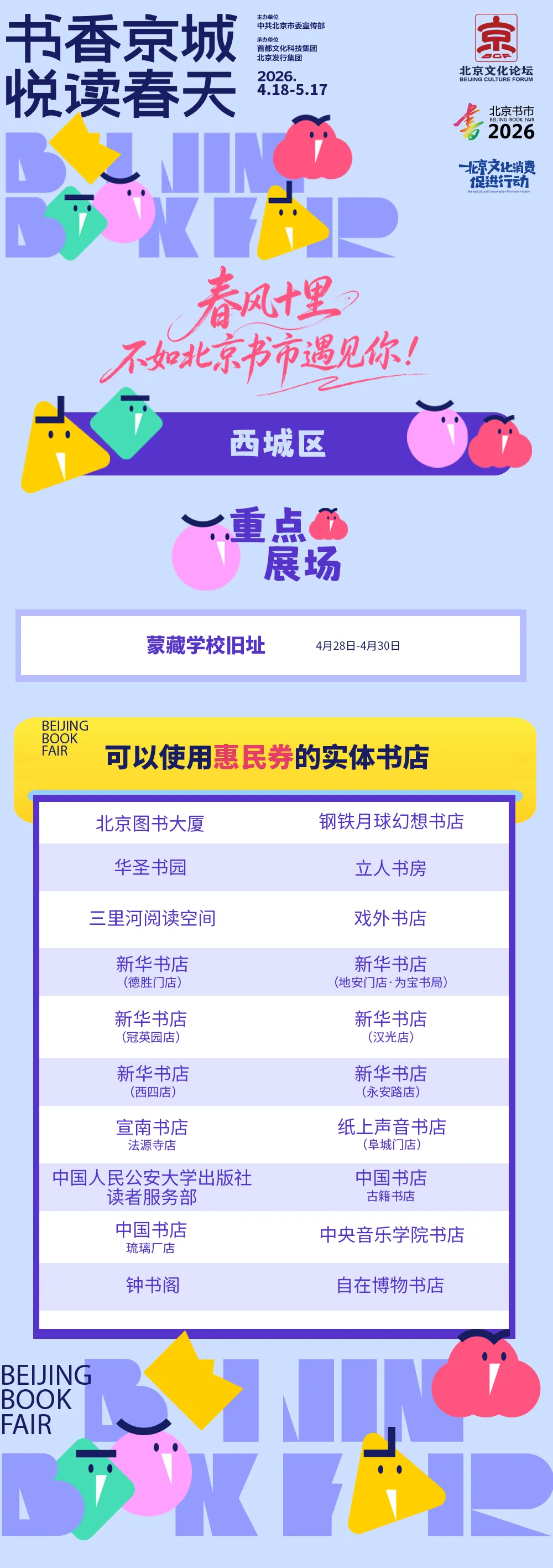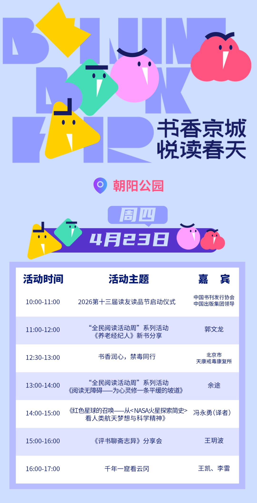 本次书市着力打造“悦读春天大讲堂”活动矩阵,将在朝阳公园、南苑森林湿地公园、首钢园、圆明园四大集中展场,以及隆福寺、钟鼓楼等北京文化地标和全市实体书店,举办超500场精彩活动,场次密集、覆盖范围更广,让书香从核心展场延伸至街头巷尾,全面提升读者参与度和获得感。