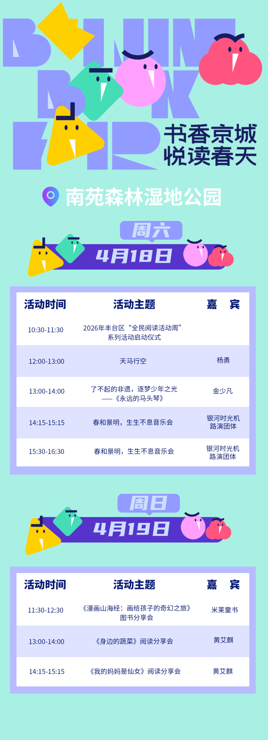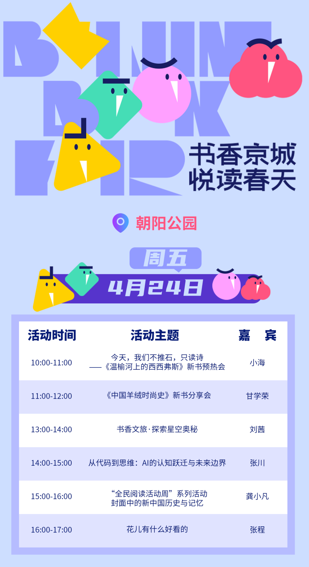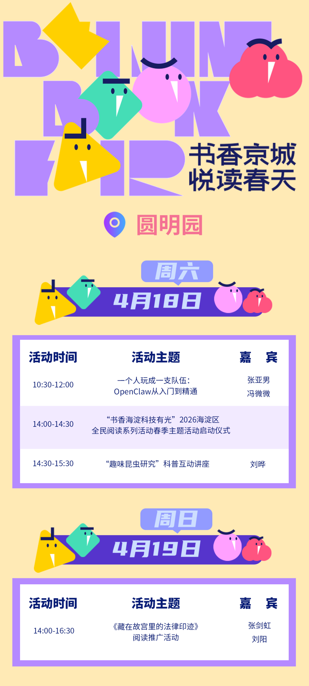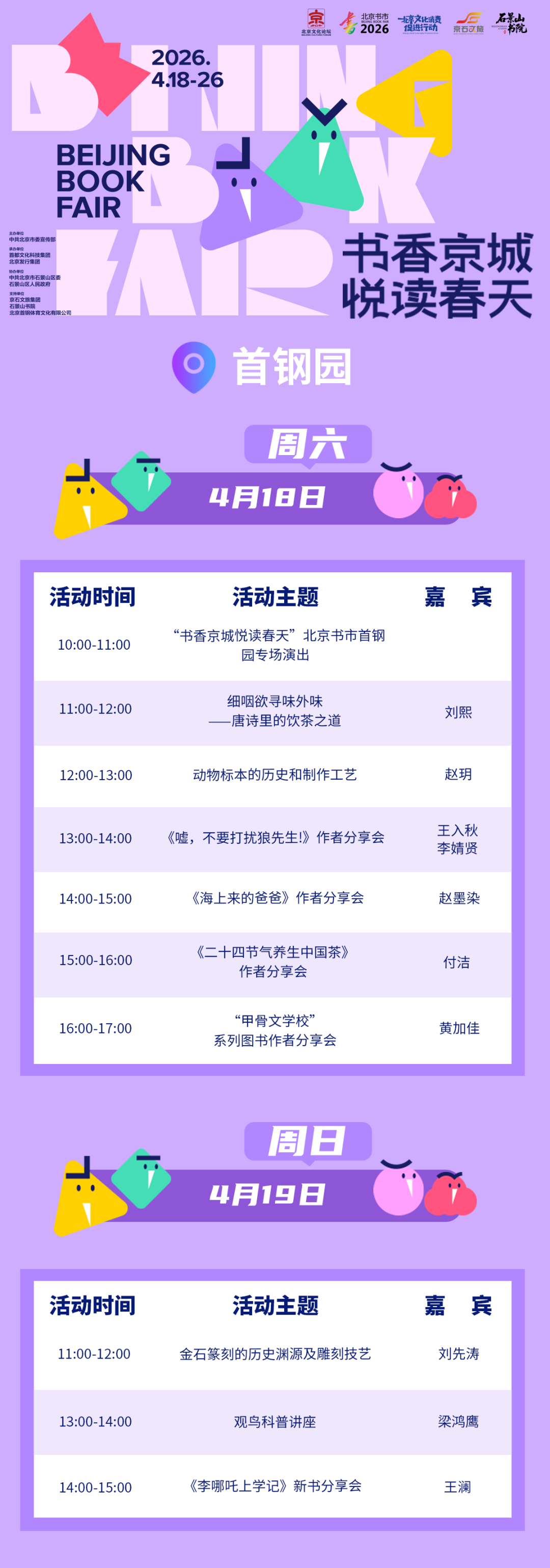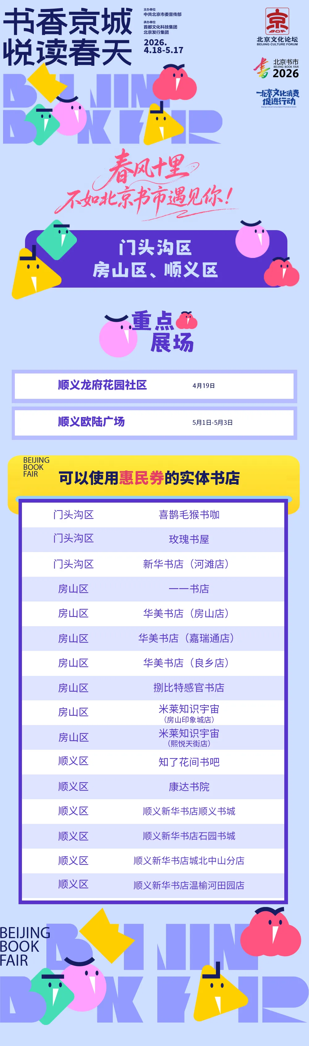 本次书市着力打造“悦读春天大讲堂”活动矩阵,将在朝阳公园、南苑森林湿地公园、首钢园、圆明园四大集中展场,以及隆福寺、钟鼓楼等北京文化地标和全市实体书店,举办超500场精彩活动,场次密集、覆盖范围更广,让书香从核心展场延伸至街头巷尾,全面提升读者参与度和获得感。