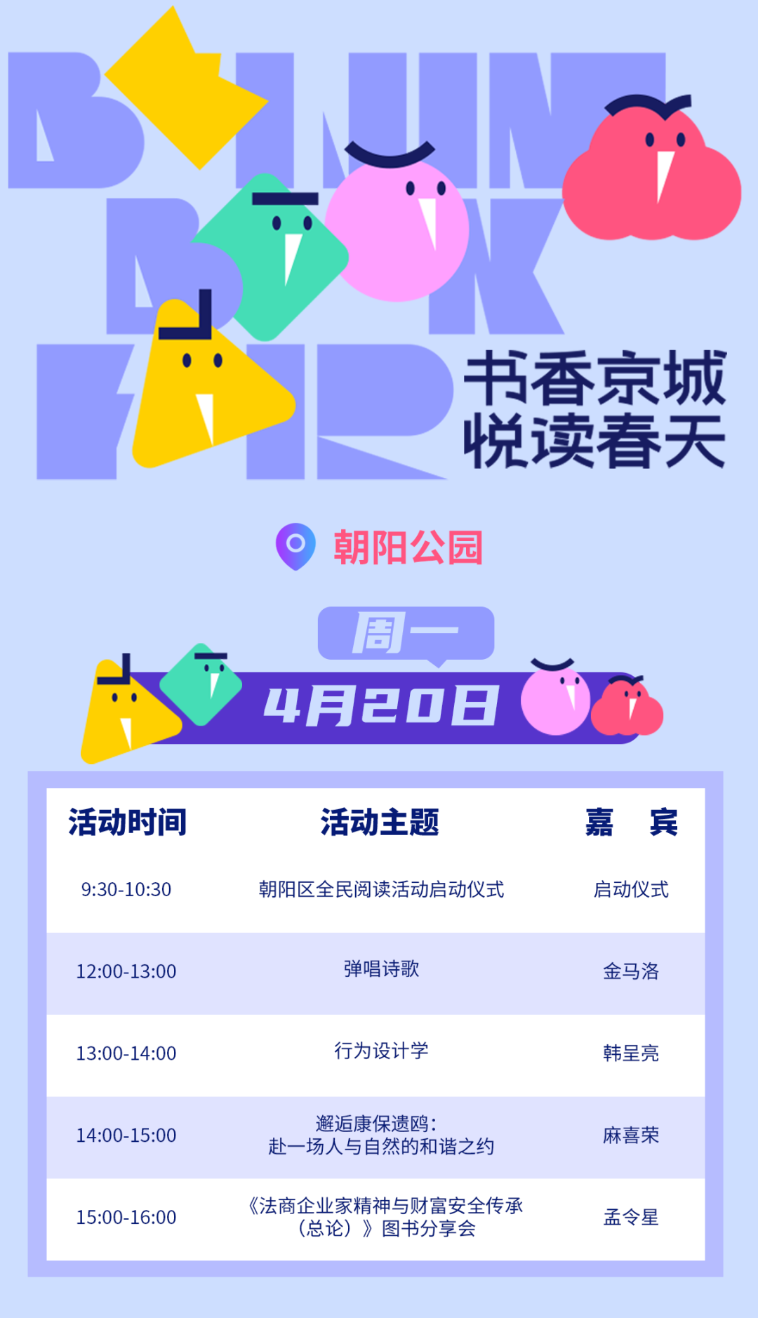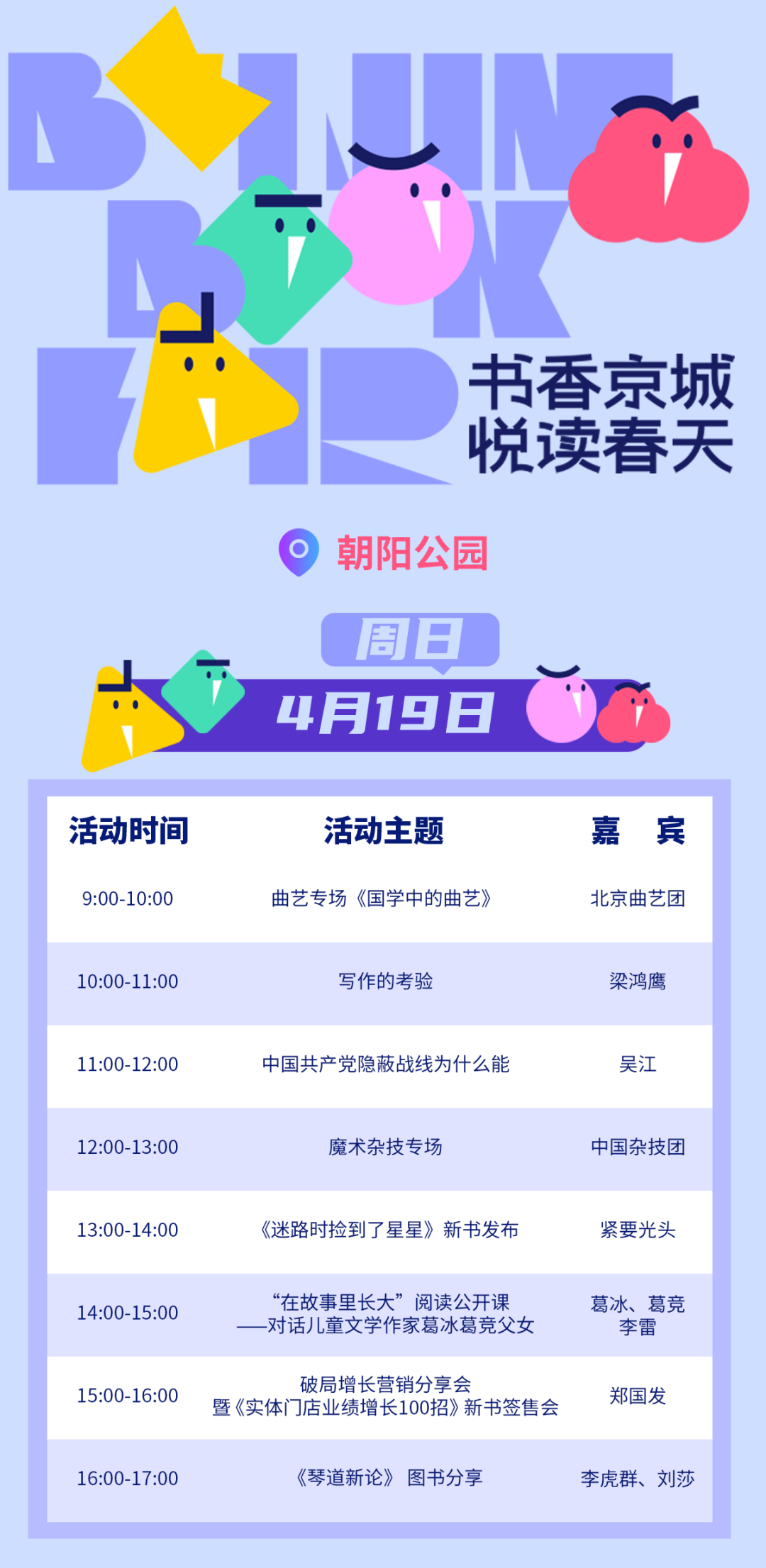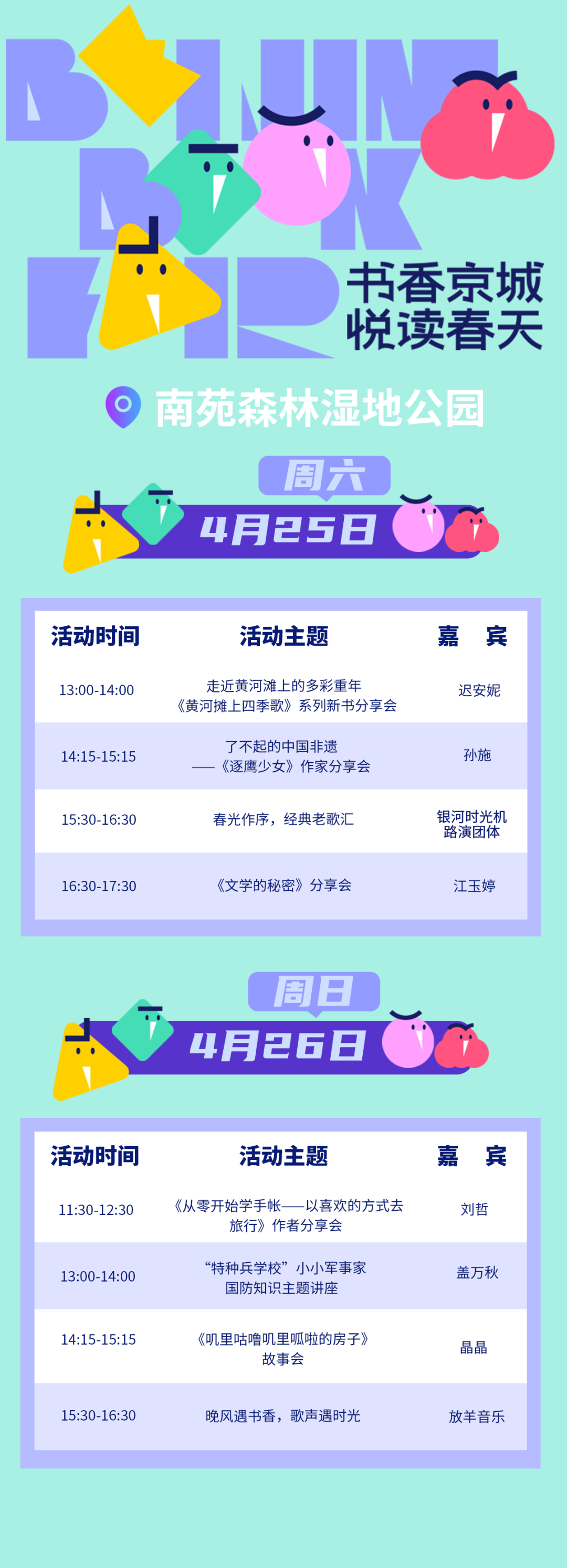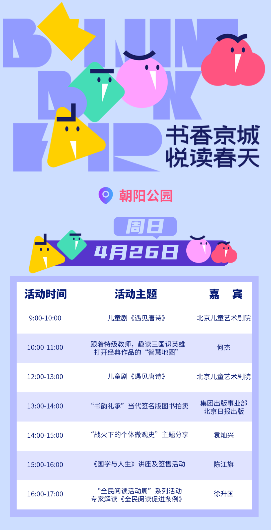 本次书市着力打造“悦读春天大讲堂”活动矩阵,将在朝阳公园、南苑森林湿地公园、首钢园、圆明园四大集中展场,以及隆福寺、钟鼓楼等北京文化地标和全市实体书店,举办超500场精彩活动,场次密集、覆盖范围更广,让书香从核心展场延伸至街头巷尾,全面提升读者参与度和获得感。