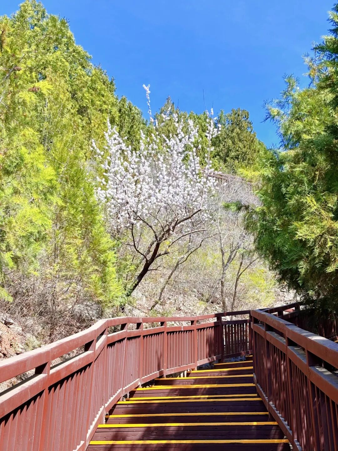 8180米木栈道,沿途山桃、山杏盛放,登顶可俯瞰雁栖湖全景、晨观日出、暮赏晚霞,栈道平缓适合全家徒步。