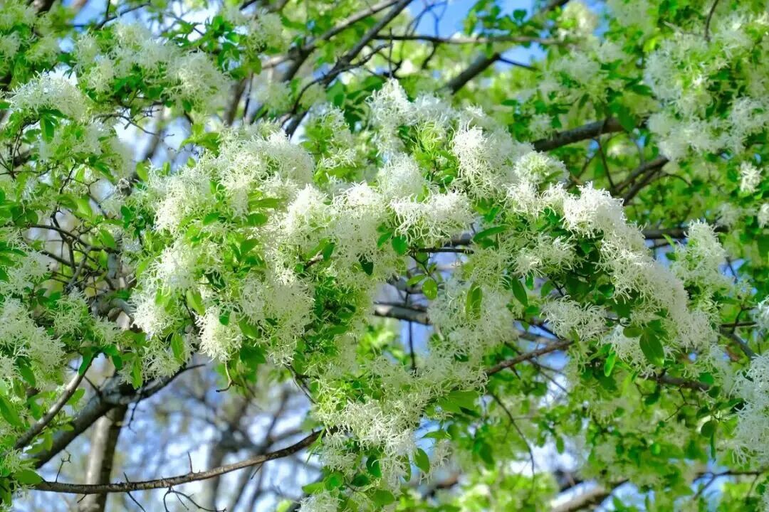 五月初至中旬是流苏树的最佳观赏期,盛开的流苏花,宛如绿树上挂满了棉花糖,花色洁白清丽,远远望去如云似雪,花香馥郁,三五里外便能闻到流苏树的花香,漫步花下,满心皆是芬芳。