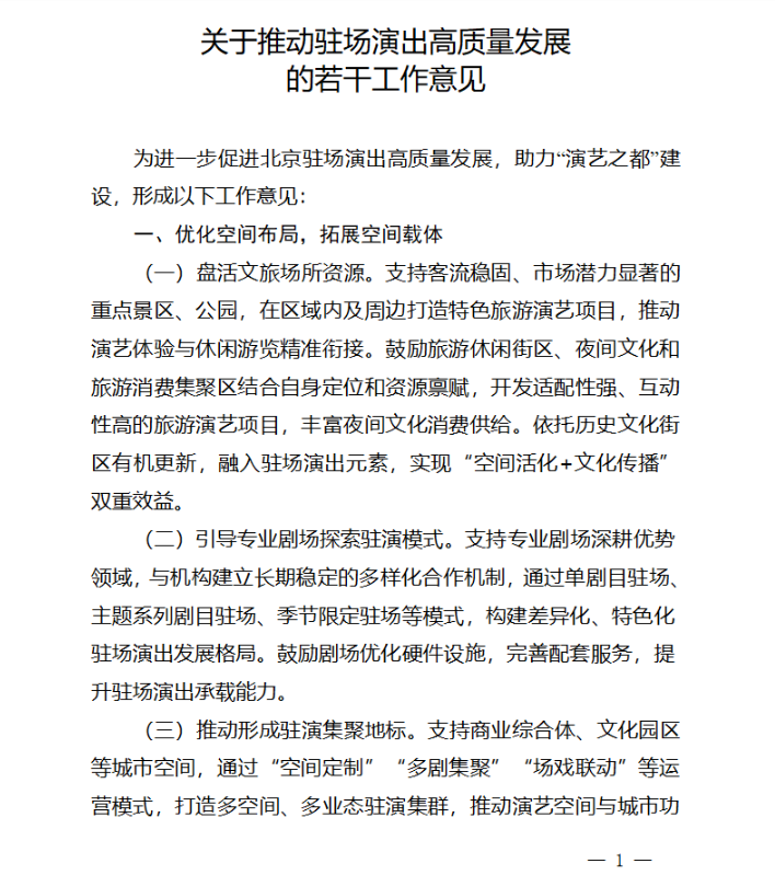 为进一步促进北京驻场演出高质量发展,助力“演艺之都”建设,我局制定了《关于推动驻场演出高质量发展的若干工作意见》,现印发给你们,请遵照执行。