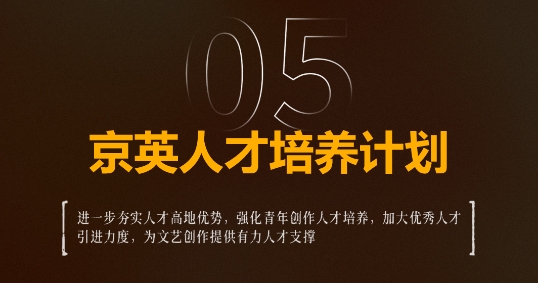 京英人才培养计划进一步夯实北京人才高地优势,强化青年创作人才培养,加大优秀人才引进力度,为文艺创作提供人才保证。