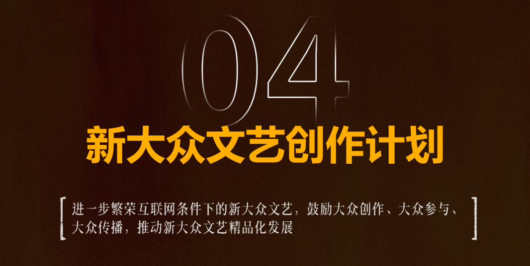 新大众文艺创作计划进一步繁荣互联网条件下的新大众文艺,鼓励大众创作、大众参与、大众传播,推动新大众文艺精品化发展。