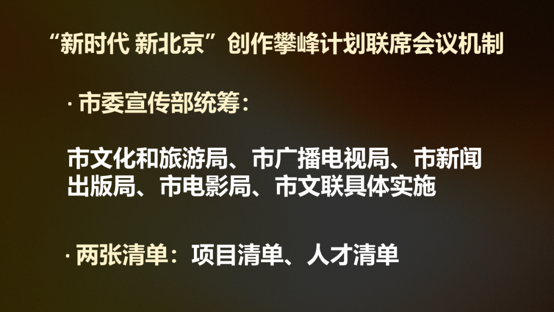 攀峰计划将设置联席会议机制,在北京市委宣传部统筹下,分别由市文化和旅游局、市广电局、市新闻出版局、市电影局、市文联等单位负责抓好相应艺术门类作品创作。同时制定“两张清单”:一张项目清单,优选“种子”项目入库;一张人才清单,为入库人才的成长和创作提供有力支持。
