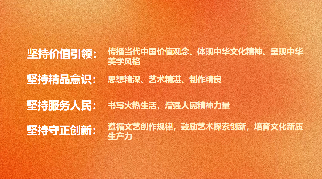 四是坚持守正创新。坚守中华文化立场,传承中华优秀传统文化。遵循文艺创作规律,鼓励艺术探索创新,推动文艺与科技深度融合,培育文化新质生产力,增强文艺作品吸引力、感染力、传播力。