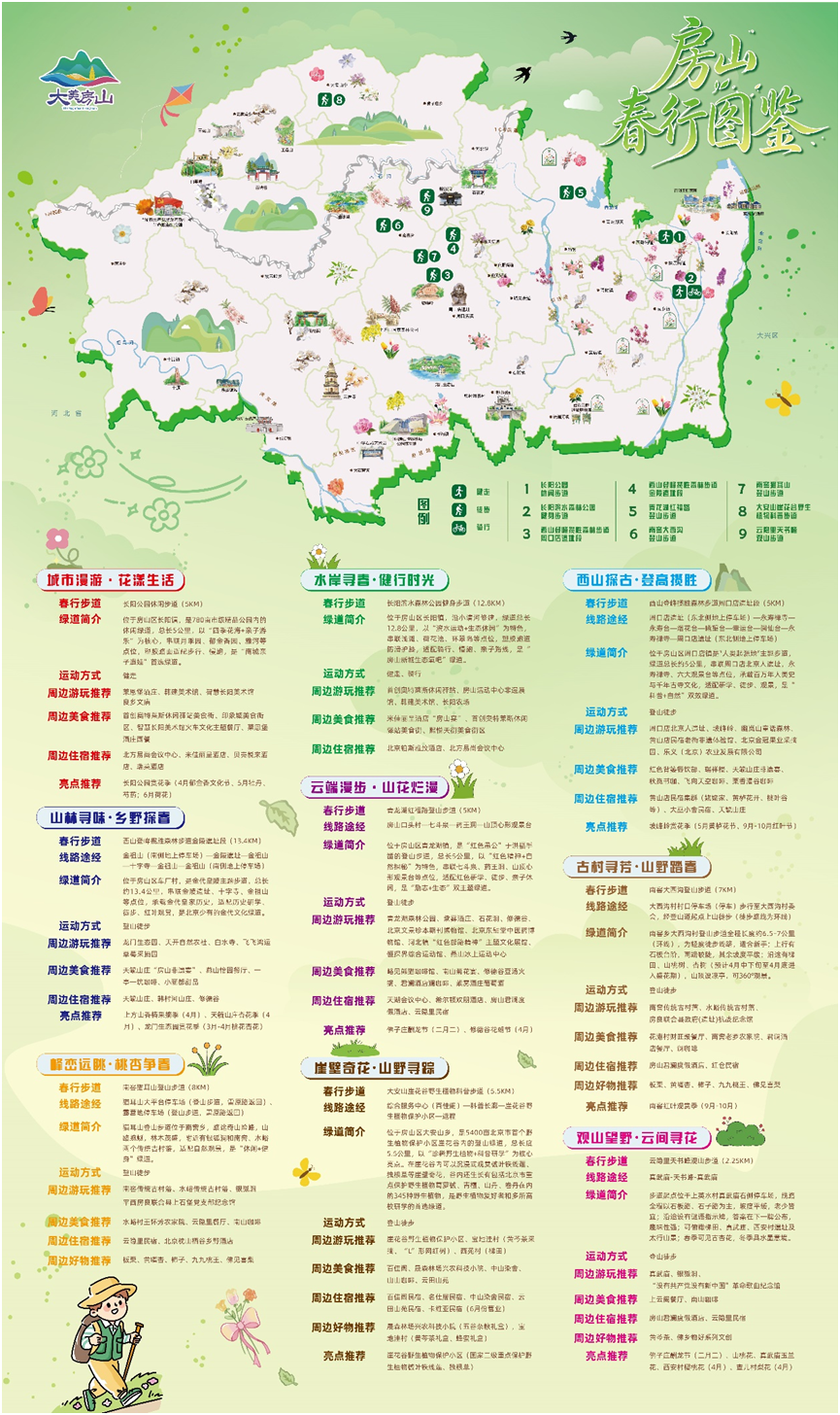 突出春季生态绿道与赏花点位,串联周边游玩、特色美食、精品民宿、瓜果采摘等优质资源,发布《房山春行图鉴》,打造集观赏性、实用性、体验性于一体的五一出游实用指南。图鉴整合长阳、周口店、青龙湖、佛子庄、南窖、大安山等多个乡镇文旅资源,融合城市休闲与山野探秘双重体验。长阳公园、长阳滨水森林公园等5条休闲绿道,适配亲子漫步、健走休闲、轻氧徒步;大安山崖花谷、南窖猫耳山、佛子庄天书峰等4条小众山野步道,聚焦珍稀植物科普、古村落探访与自然探秘,多元化满足不同人群踏青打卡、亲近自然的春日需求。