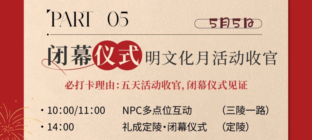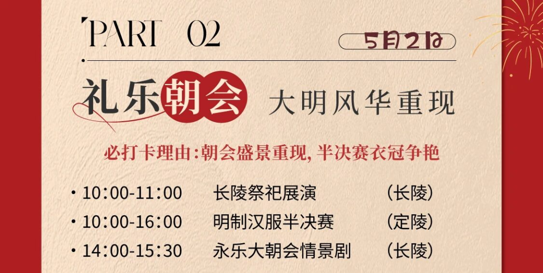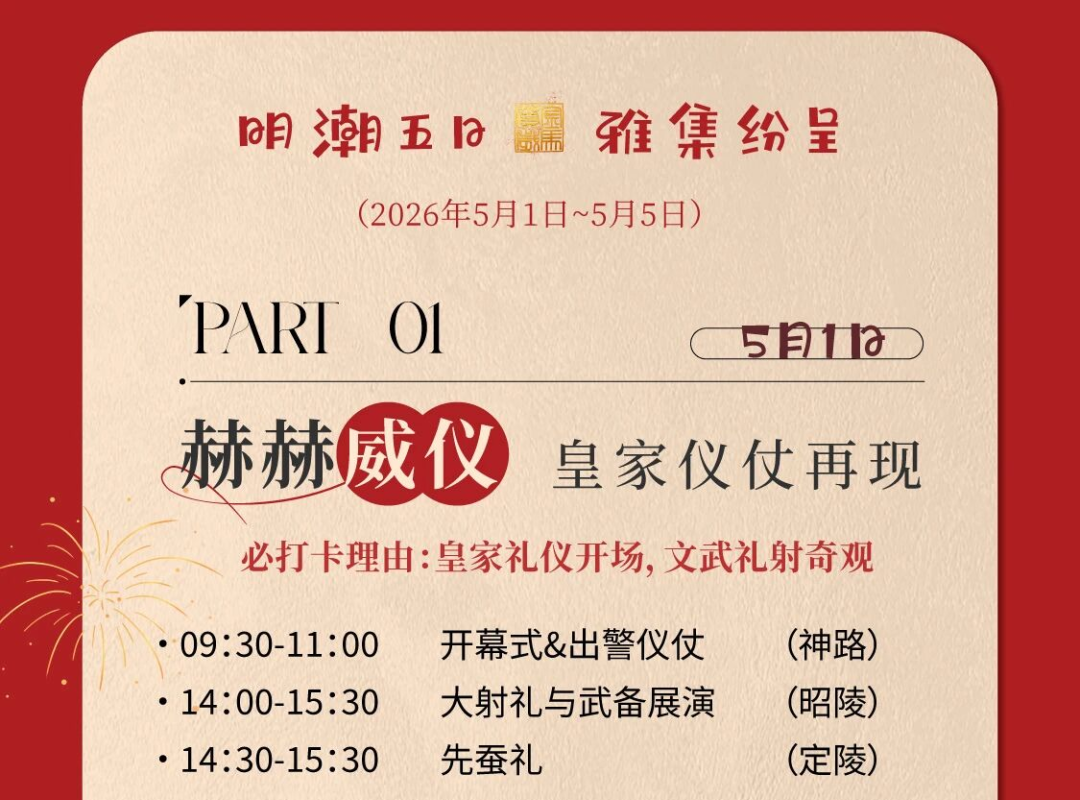 5月1日至5日,明十三陵景区明文化活动进入最隆重、最密集的核心篇章,从皇家仪休到服饰大赛,从传统射礼到沉浸式NPC互动,二十余项活动次第展开邀你步入一场跨越六百年的文化盛景。