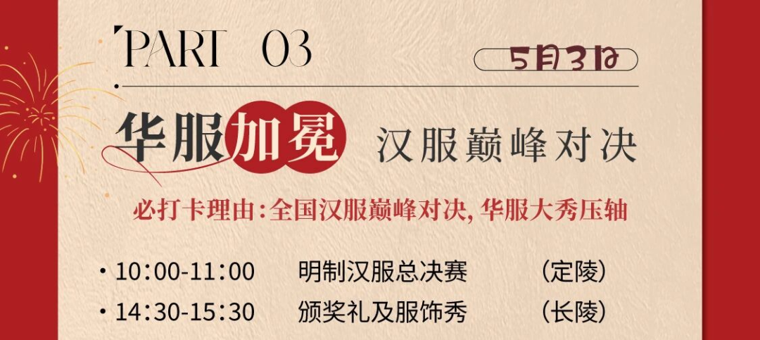 国潮服装、户外运动、高定礼服三大秀场惊艳亮相,国风巡游全天轮番上演,NPC互动、免费配饰体验。