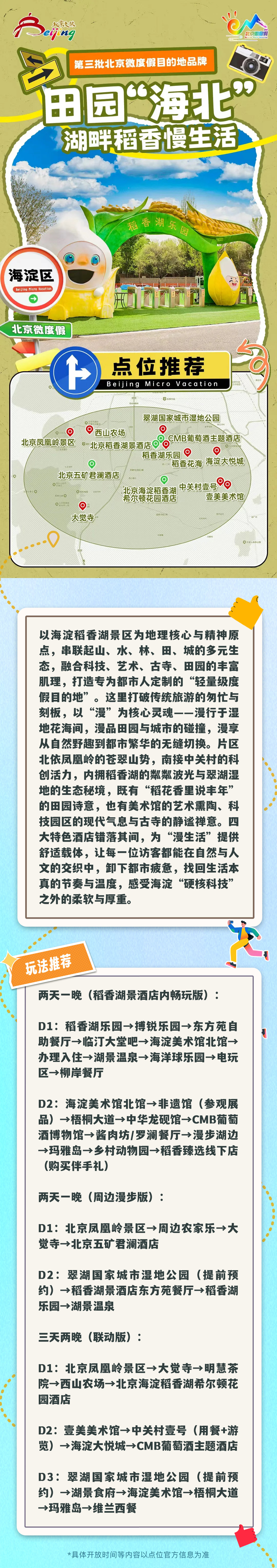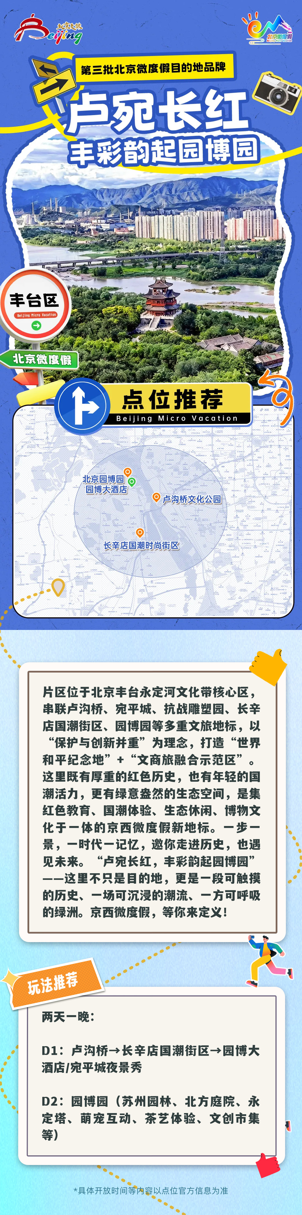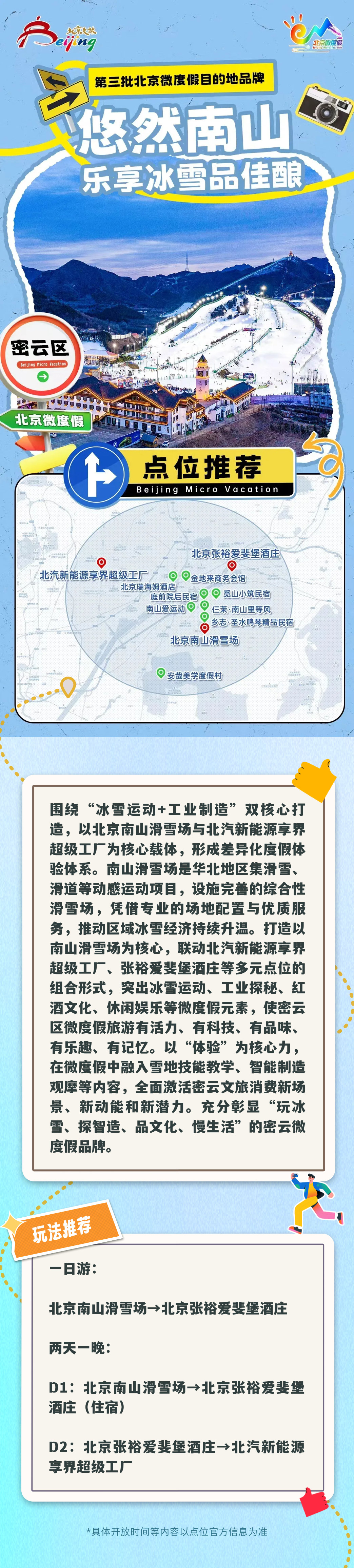 为提前营造春节、元旦的消费氛围,给广大市民游客提供更休闲、更便利、更个性的旅游选择,北京市文化和旅游局推出第三批“北京微度假”目的地品牌。8个“北京微度假”目的地呈现8个旅游片区,拥有文旅商体等多种业态,消费场景多元,各有特色、各有玩法,满足市民游客旅游度假的休闲化、个性化、品质化需求。